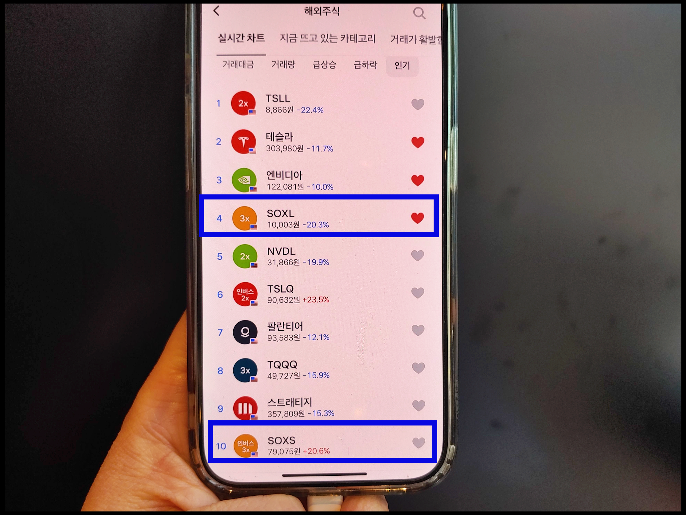 [사진 = 토스 해외주식 인기 차트 SOXL, SOXS 10위권안에 포함됐습니다. 제가 이 순위를 봤을 때는 각각 4위와 10위였습니다. 전자가 -20.3% 기록했다면 후자는 20.6% 올랐습니다. 서로 반대되는 성격임을 알 수 있습니다. 특히 후자는 최근 3개월 사이에 123.6% 올랐다고 합니다. 장 초반 급등세도 있었습니다. 둘 다 변동성이 높은 종목이라 앞으로의 추이가 어떻게 될지 알 수 없습니다. (C) 토스 앱]