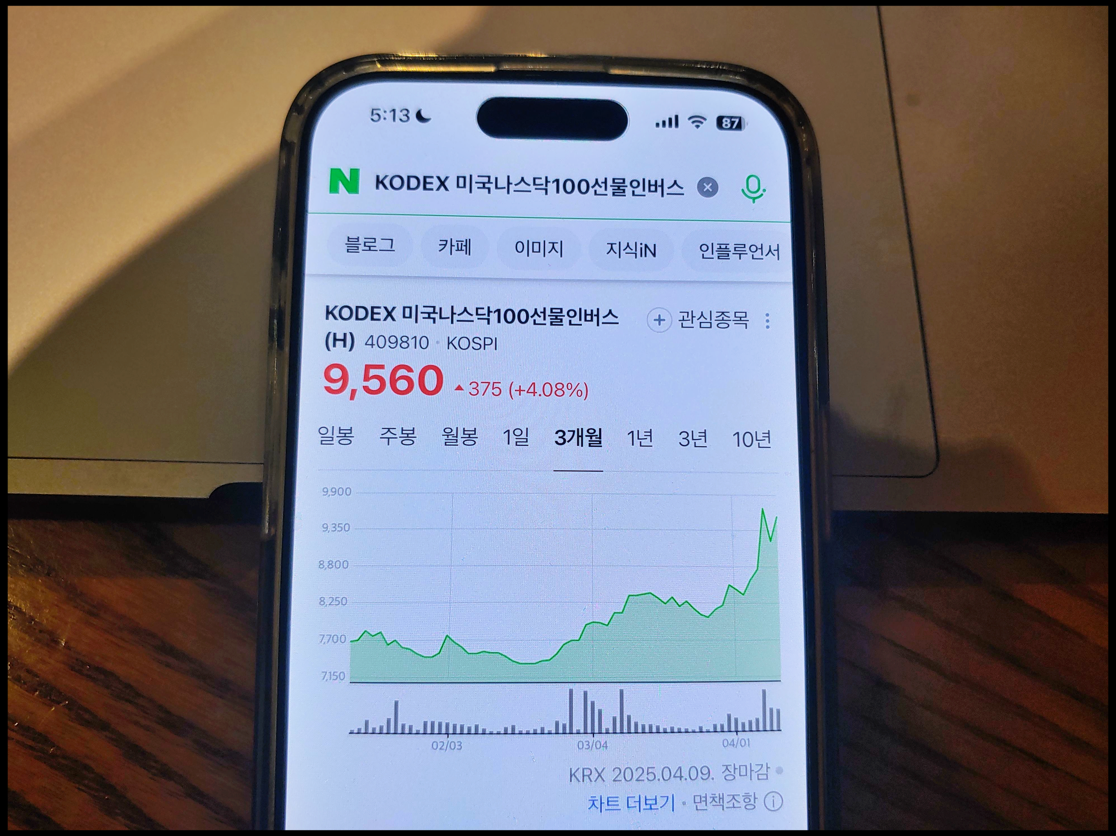 [사진 = 4월 9일 한국 코스피 지수 2,200선으로 내려 앉았습니다. 지난 3월에는 2,600선이었는데 트럼프 관세 이슈 이후로 2,200선까지 밀렸습니다. 앞으로의 추이가 어떻게 될지는 아무도 모릅니다. 반대로 국내 상장된 종목중에 KODEX 미국나스닥100선물인버스(H)는 올랐습니다. 앞에서 언급했던 나스닥 100 인버스 ETF 종목입니다. (C) 네이버 앱]