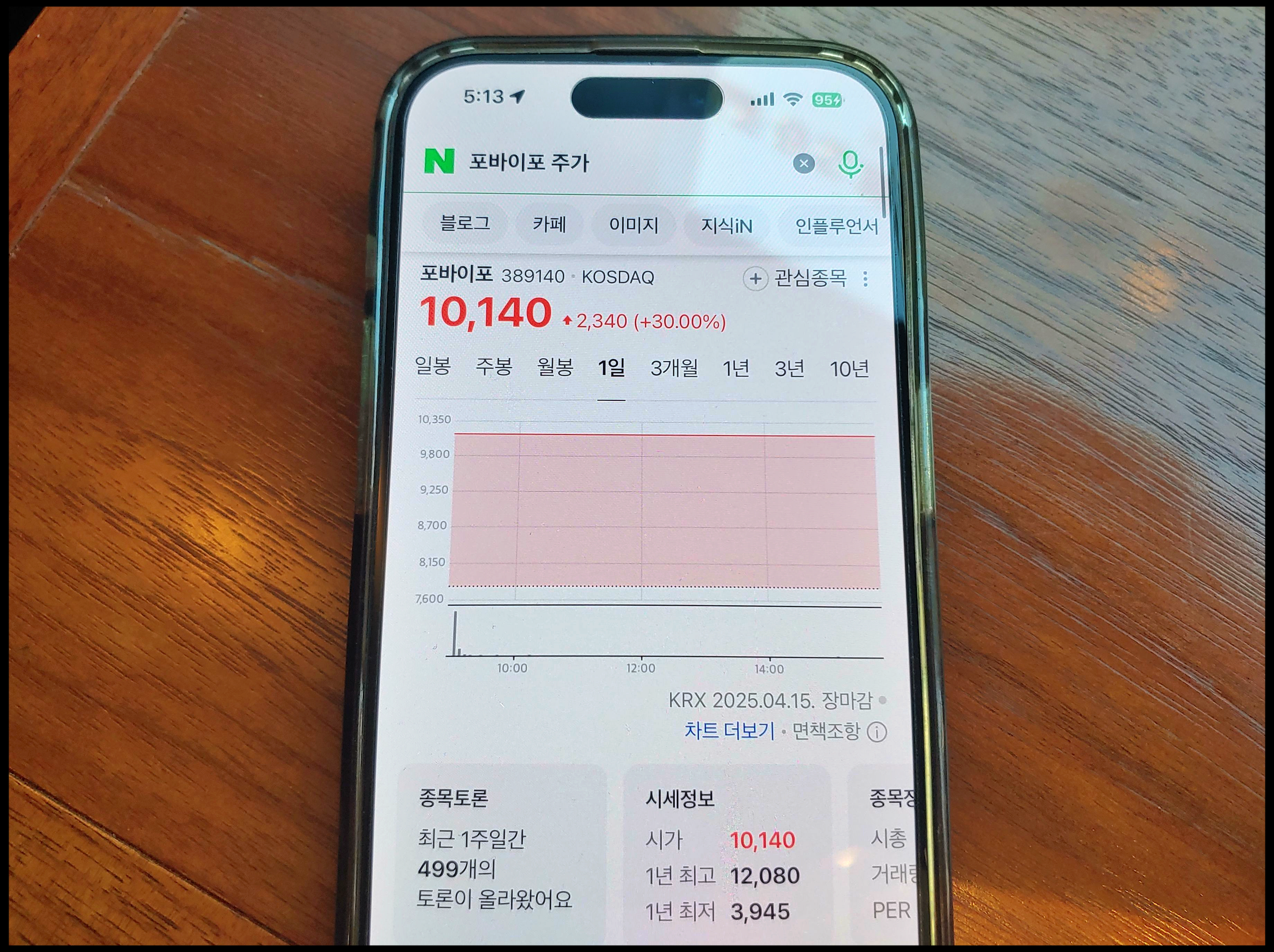 [사진 = 4월 15일에는 포바이포 30%, 와이즈넛 8% 올랐습니다. 이 전 대표의 퓨리오사 AI 본사 방문과 연관이 있는 것으로 보입니다. (C) 네이버 앱]