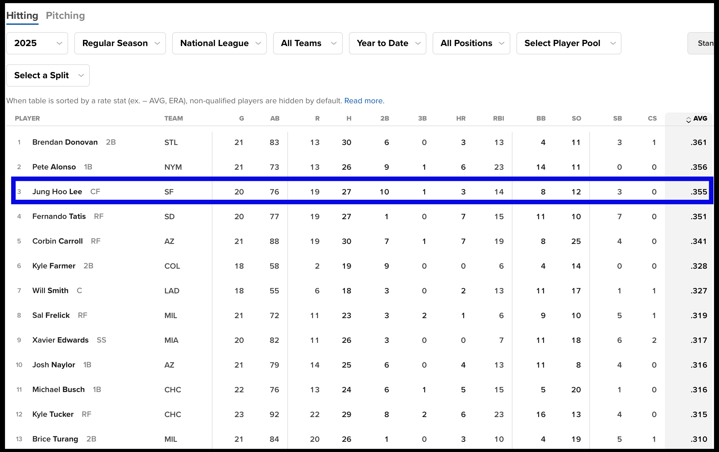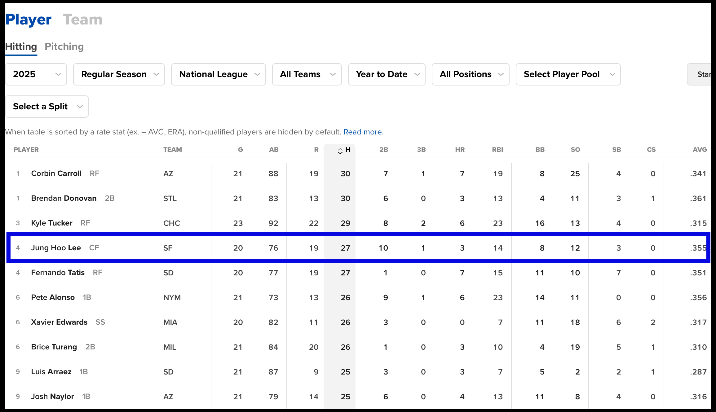 [사진 = 이정후 메이저리그 내셔널리그 4월 20일 현재 기준 타율 0.355(3위) 안타 27개(4위) 기록중입니다. (C) 메이저리그 공식 홈페이지(mlb.com)]