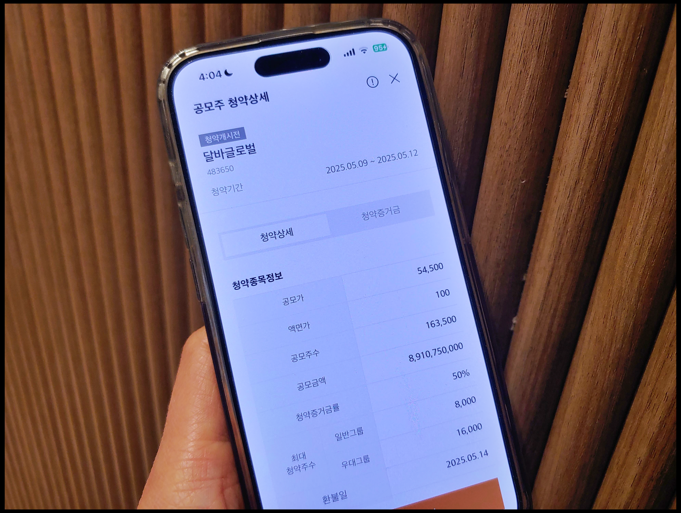 [사진 = 달바글로벌 공모주 주관사 미래에셋증권입니다. 청약기간 5월 9일과 12일이며 그 사이의 주말은 국내증시 휴장입니다. 환불일 5월 14일로서 신청일과 이틀 간격입니다. 상장 예정일은 5월 22일로 되어 있습니다. 희망 공모가 밴드 54,500원 ~ 66,300원입니다. (해당 증권사 앱에서는 공모가 밴드 하단 금액으로 표기. 수요예측 결과에 따라 공모가 항목 변경 가능성 있음) 이 종목과 청약 일정 겹치는 다른 두 종목이 있습니다. 이뮨온시아 5월 7~8일, 바이오비쥬 5월 8~9일 입니다. (C) 미래에셋증권 앱]