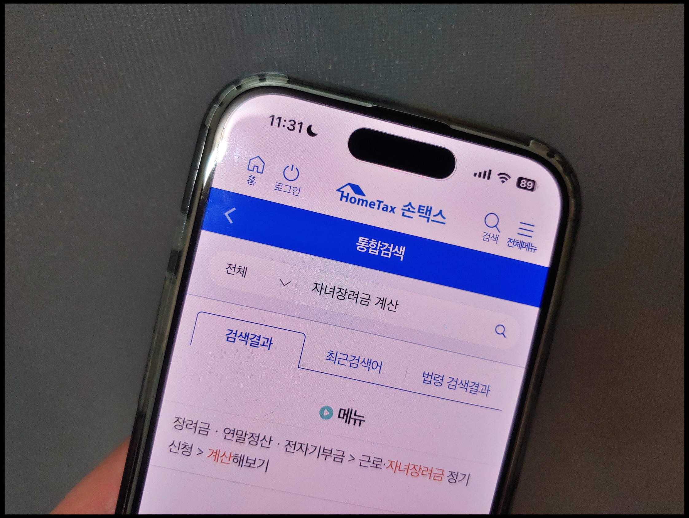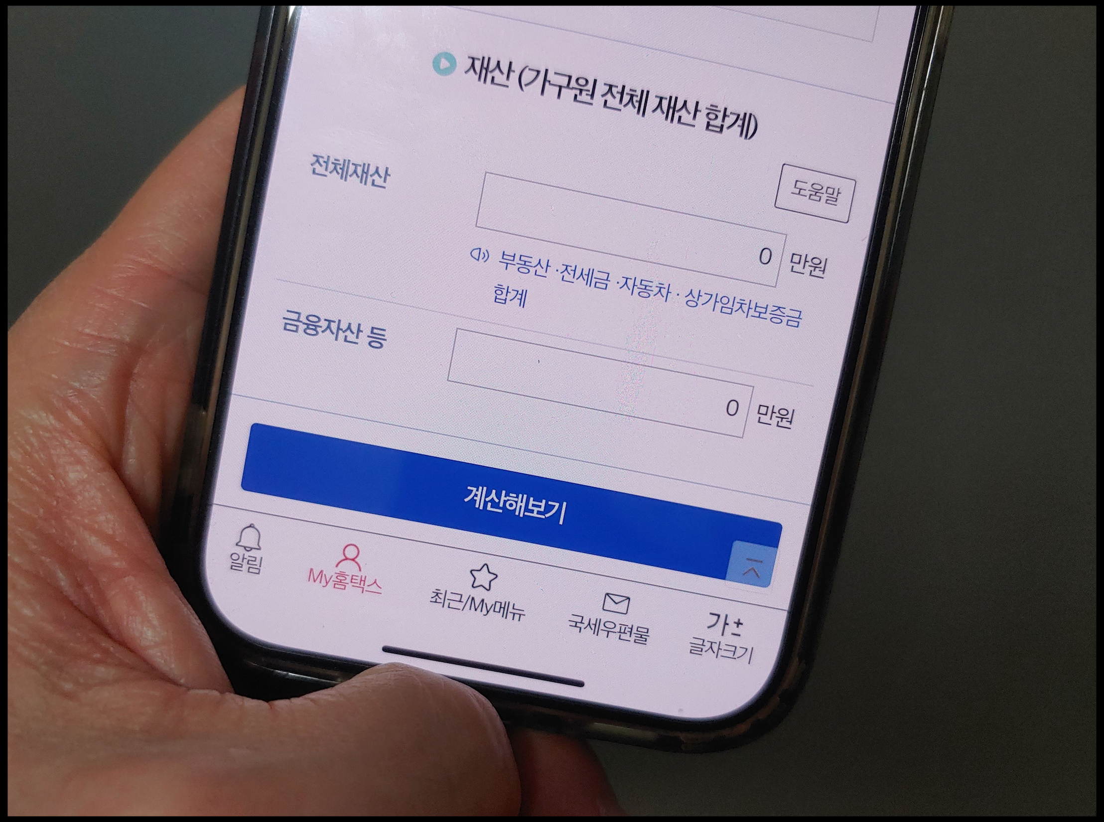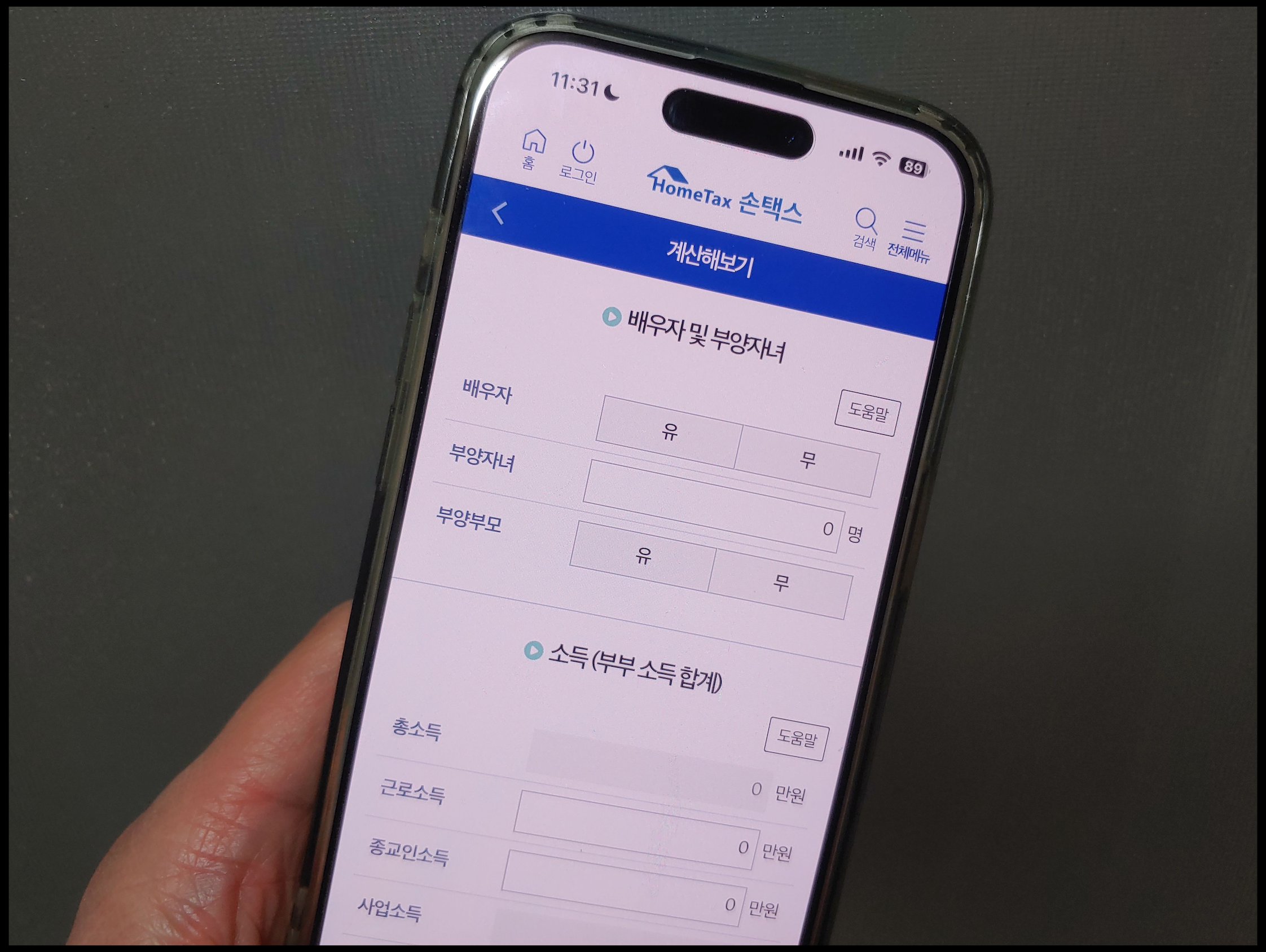 [사진 = 손택스에 근로 및 자녀장려금 계산 기능이 있습니다. 배우자 및 부양자녀, 소득(부부 소득 합계), 재산(가구원 전체 합계) 통해서 계산을 할 수 있습니다. (C) 국세청 손택스 앱]