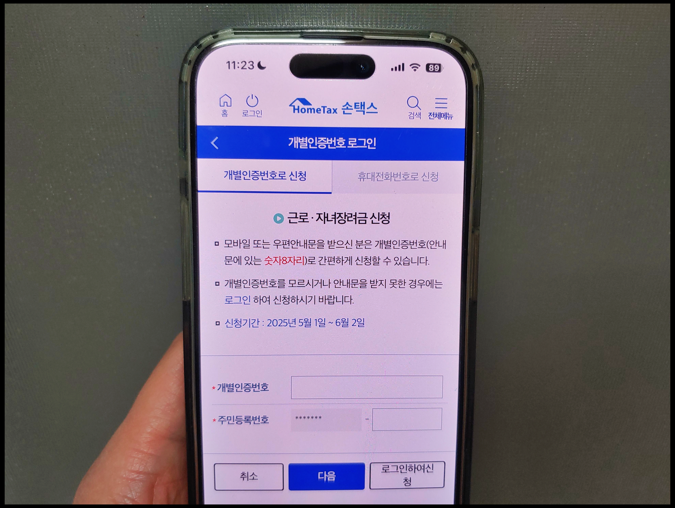 [사진 = 2025년 근로 자녀장려금 신청기간 5월 1일 ~ 6월 2일까지 입니다. 이미 모바일 or 우편안내문 통해서 안내 받으신 분이 많을 겁니다. 만약 신청하려면 안내문에 나와있는 숫자 8자리가 자신의 개별인증번호 입니다. 그 숫자로 진행하시면 됩니다. 휴대전화번호로도 진행할 수 있습니다. 만약 안내문 못받으셨다면 홈택스 통해서 안내대상자 여부 확인한 뒤에 신청 가능한 것으로 보입니다. (C) 국세청 손택스 앱]