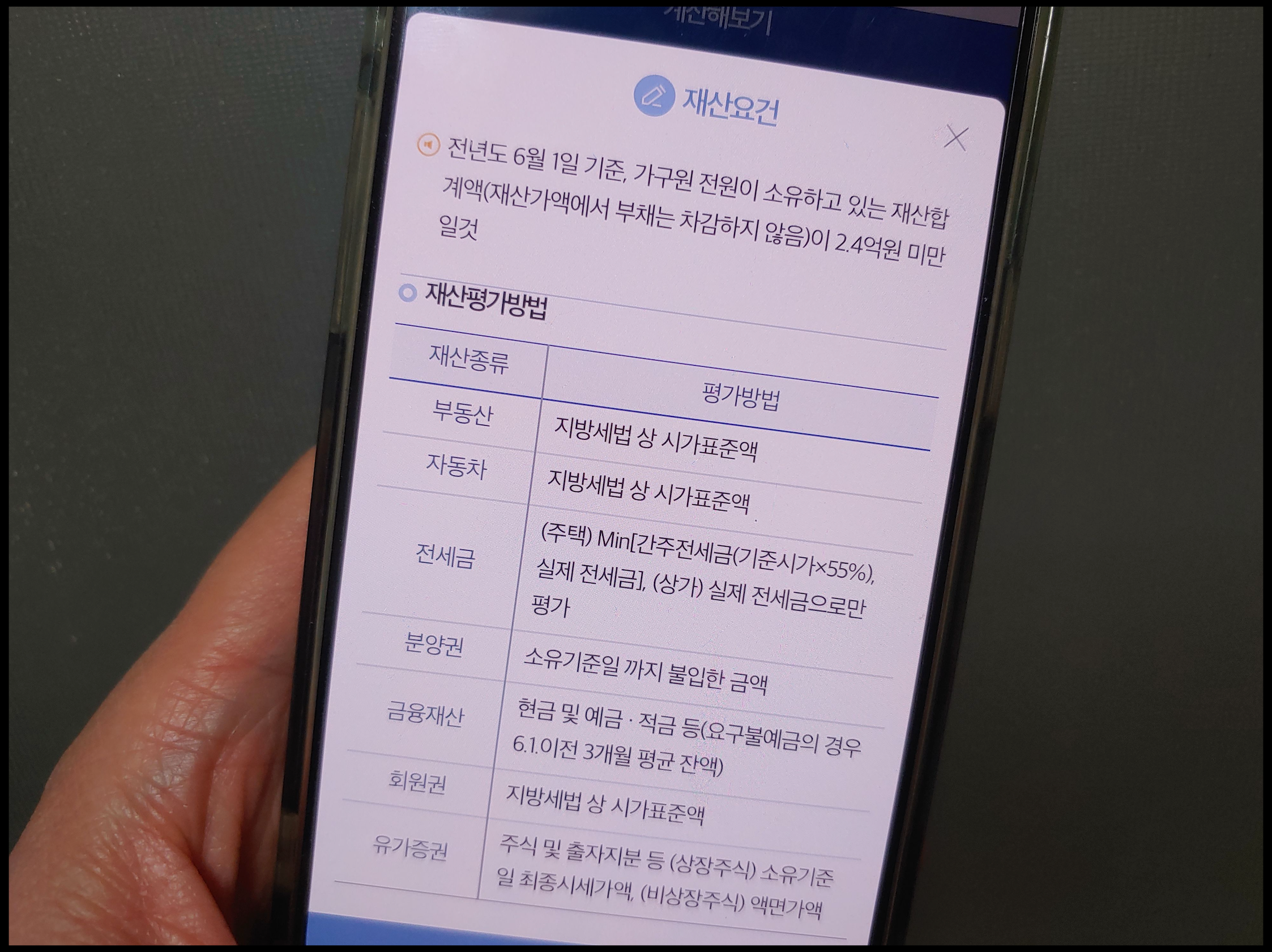 재산 요건 : 가구원 전체 주택, 토지, 승용자동차, 전세금, 금융자산 등의 재산을 다 합친 금액이 2억 4,000만 원 미만이어야 함(2024년 6월 1일 기준, 재산 가액에서 부채는 차감되지 않음)