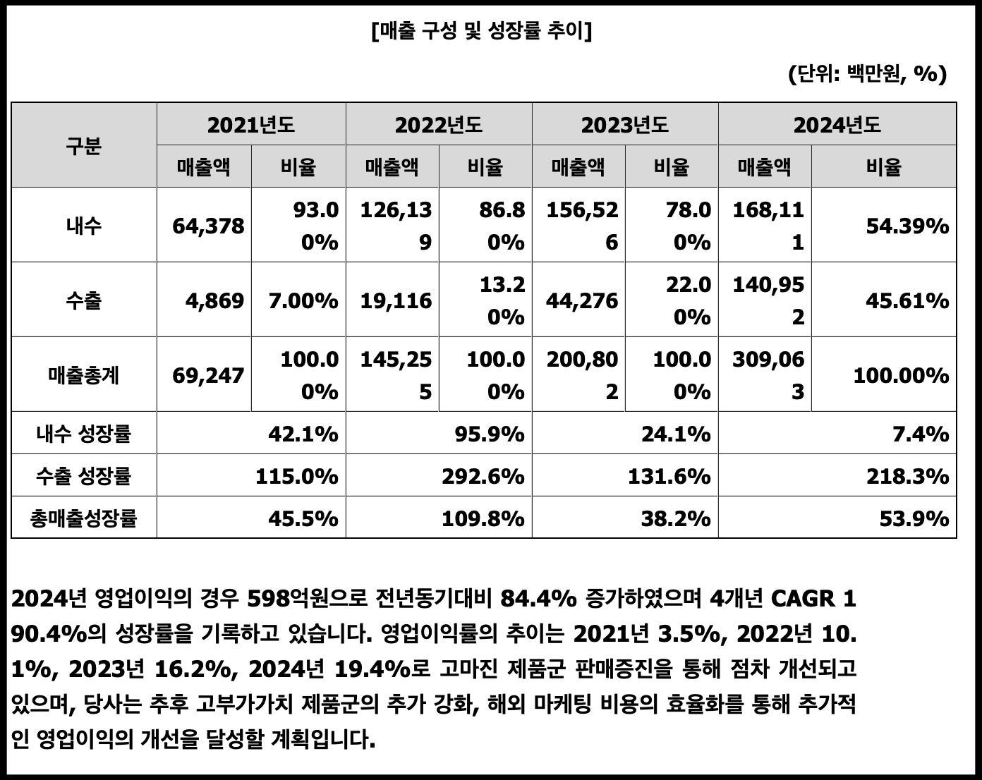 매출액 : 692.5억 원(2021년) 1,452.6억 원(2022년) 2,008억 원(2023년) 3,090.6억 원(2024년)