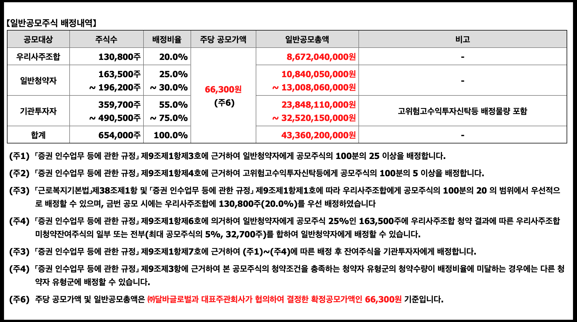 [사진 = 달바글로벌 공모주 일반 청약자 163,500주 배정됩니다. 균등 및 비례 각각 81,750주로서 1주 배정 받기 위한 일반 청약자들의 경쟁이 치열할 것으로 보입니다. 이 종목의 주관사는 미래에셋증권입니다. 최종 공모가 66,300원, 최소 청약 수량 10주로서 청약 증거금 331,500원입니다. 이 금액으로 청약 신청하면서 균등 1주 노릴 수 있습니다. (C) DART 공식 홈페이지]