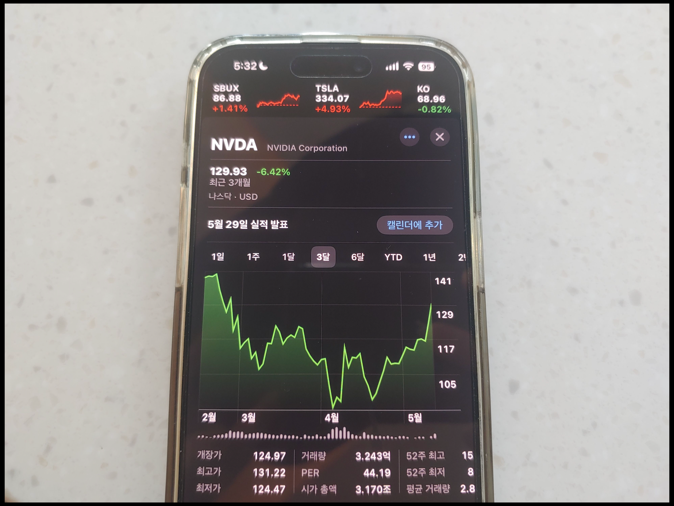 [사진 = 엔비디아 주가 지난 3개월 동안 추이 변동폭 컸습니다. 정확히 3개월 전 140달러대에 있었으나 2024년 4분기 실적발표 임박한 시점에 조정을 받았습니다. 그 이후 회복되었다가 4월에 접어들면서 트럼프 관세 리스크 영향 받으며 폭락했습니다. 4월에 100달러 미만이었던 시기가 두 번 있었습니다. 5월에 이르러 미중 무역협상 및 사우디 AI 스타트업 칩 공급 호재가 나오면서 5월 13일 129.93달러로 마감했습니다. (C) 아이폰 주식 앱]