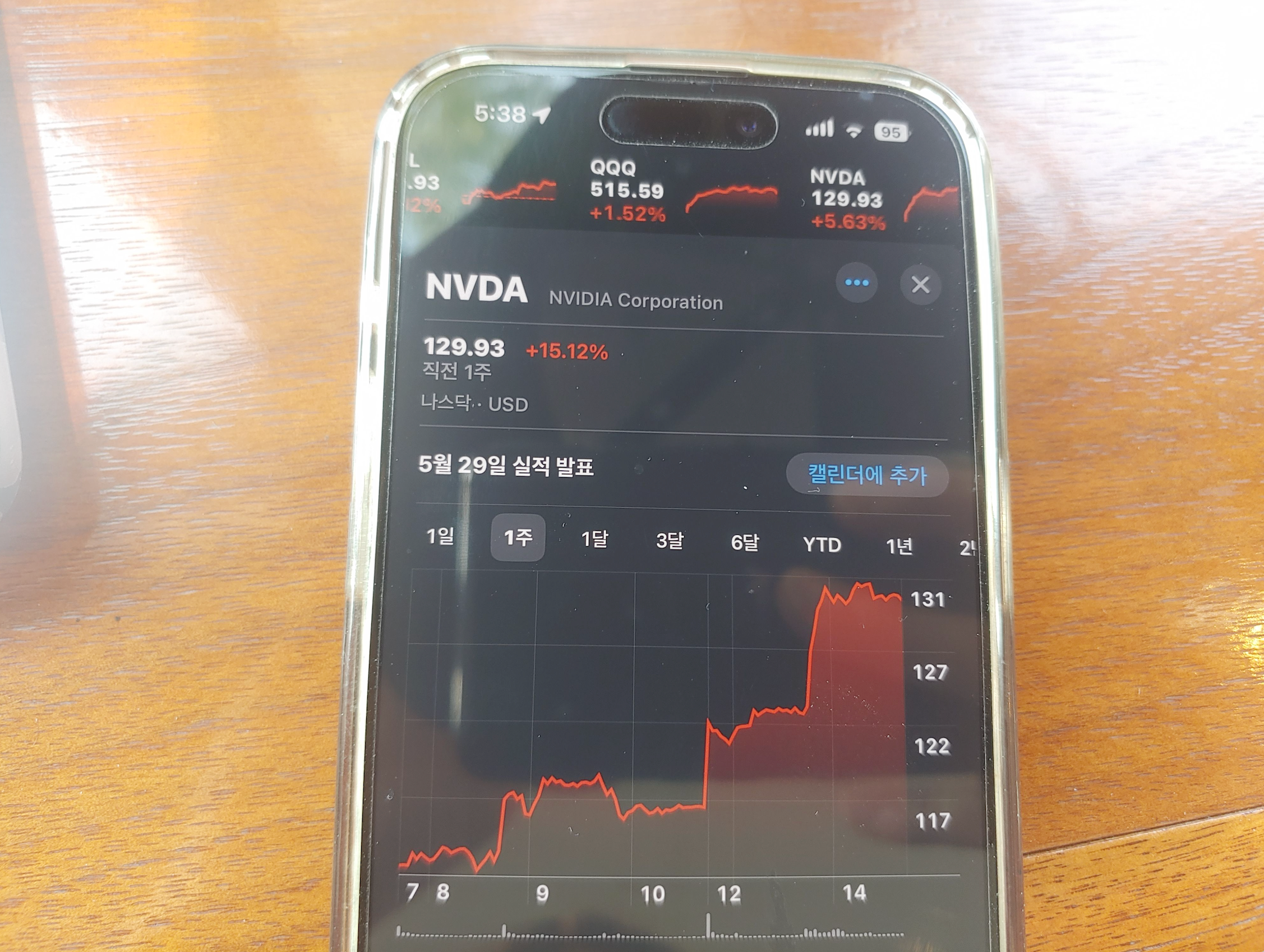 [사진 = 이 종목의 지난 1주일 및 5월 13일 하루 동안(+5.63%)의 주가 추이는 이 종목 투자자들을 웃게 했습니다. 호재가 연이어 나왔습니다. 5월 14일 프리장에서는 2.09% 오른 132.64달러 기록중입니다. 과연 본장에서 130달러 넘을지 기대됩니다. (C) 아이폰 주식 앱]
