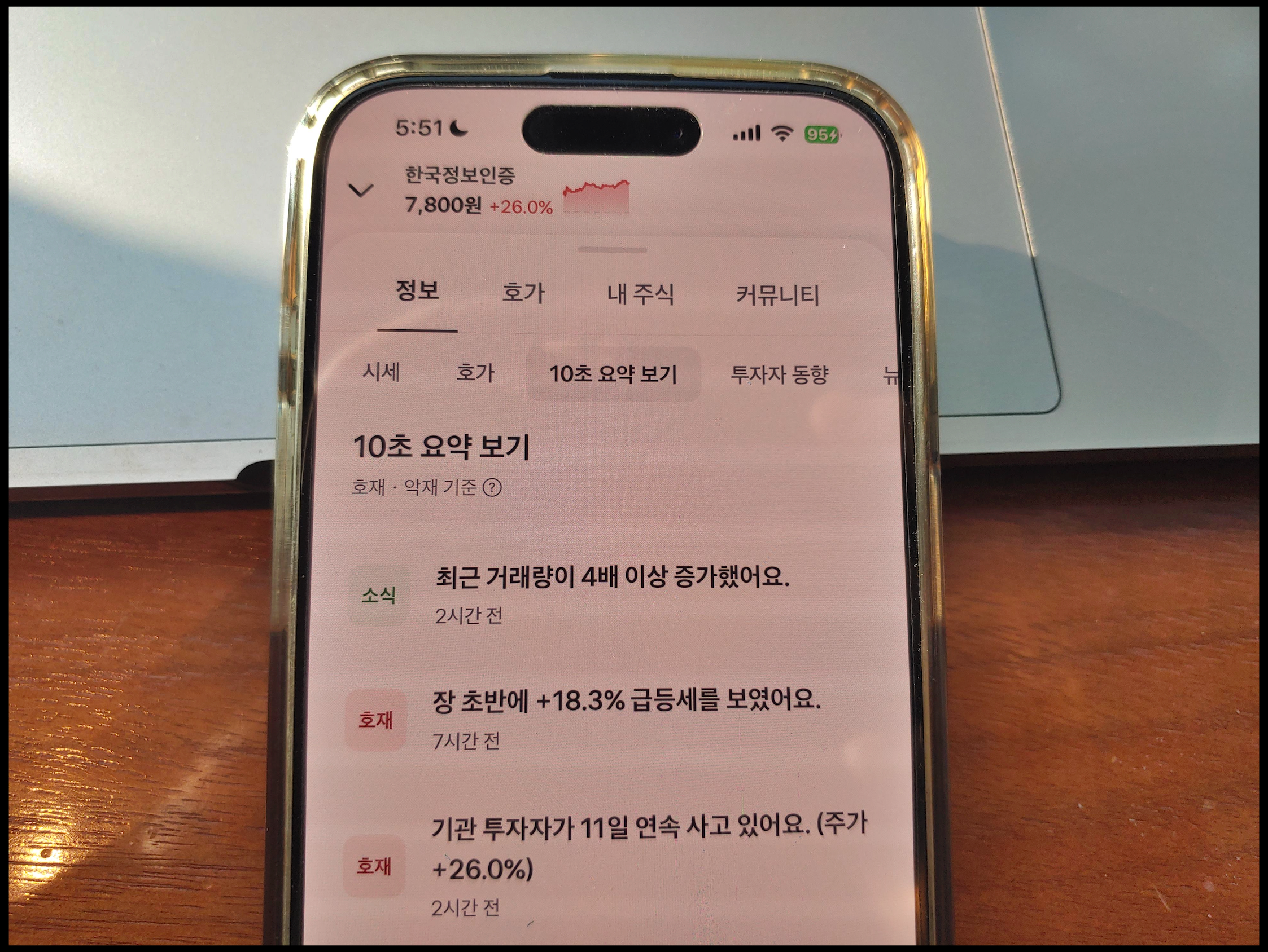 [사진 = 한국 스테이블코인 관련주 중에서 대장주 종목으로 꼽히는 한국정보인증 6월 9일 26.0% 오른 7,800원 기록했습니다. 이날은 최근 거래량이 4배 이상 증가했으며, 기관 투자자는 11일 연속 사는 흐름이라고 합니다. 국내 주식시장에서 인기 높은 상황입니다. (C) 토스 앱]
