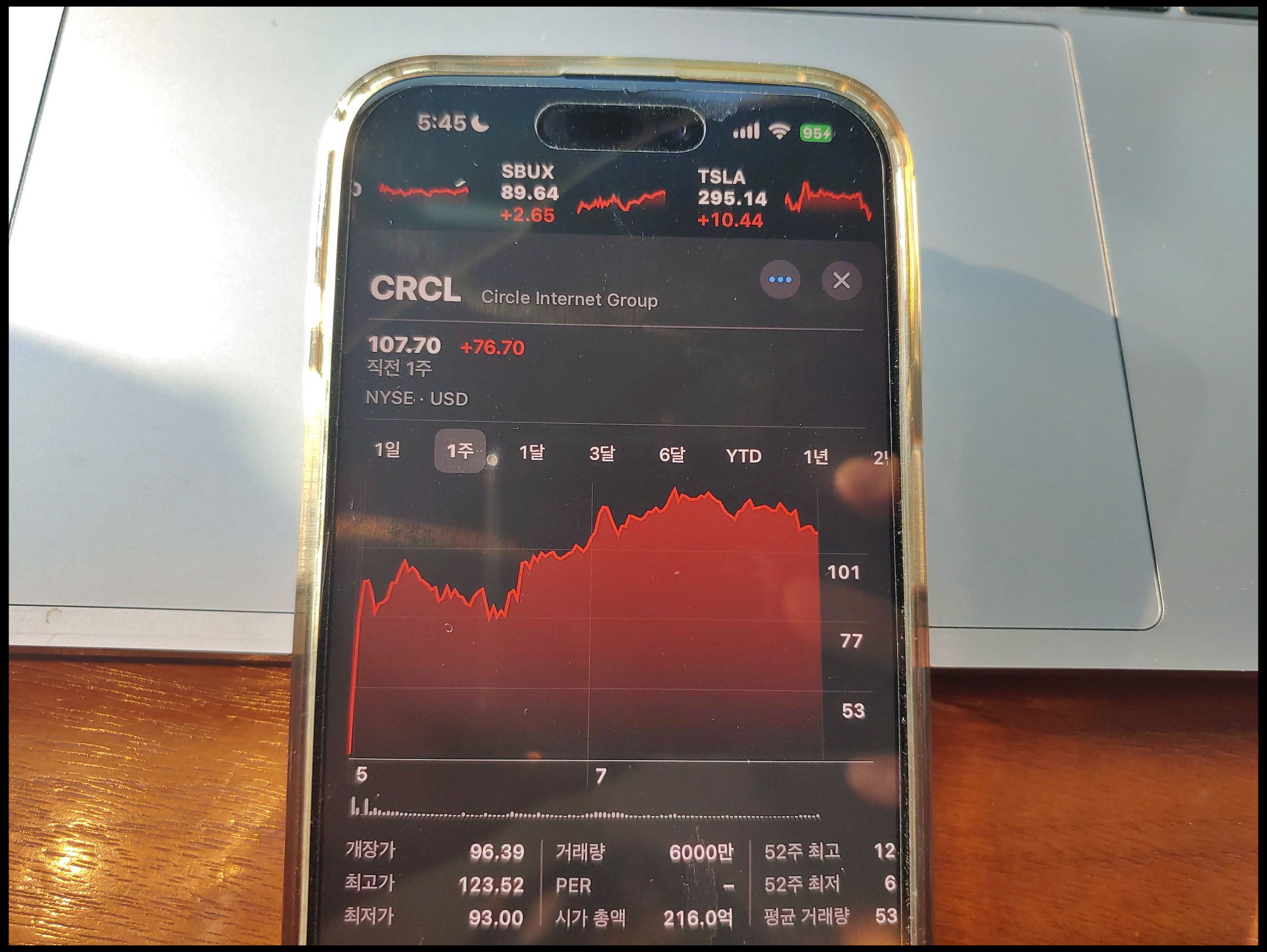 [사진 = 지난 5일 뉴욕증권거래소 상장했던 서클 주가 오름세 눈에 띕니다. 공모가 31달러였는데 다음날 107.70달러로 마쳤으며, 장중 123.52달러까지 올랐습니다. 6월 9일 프리장에서는 121.70달러 기록중입니다. 공모가보다 거의 4배 높은 기록입니다. (C) 아이폰 주식 앱]