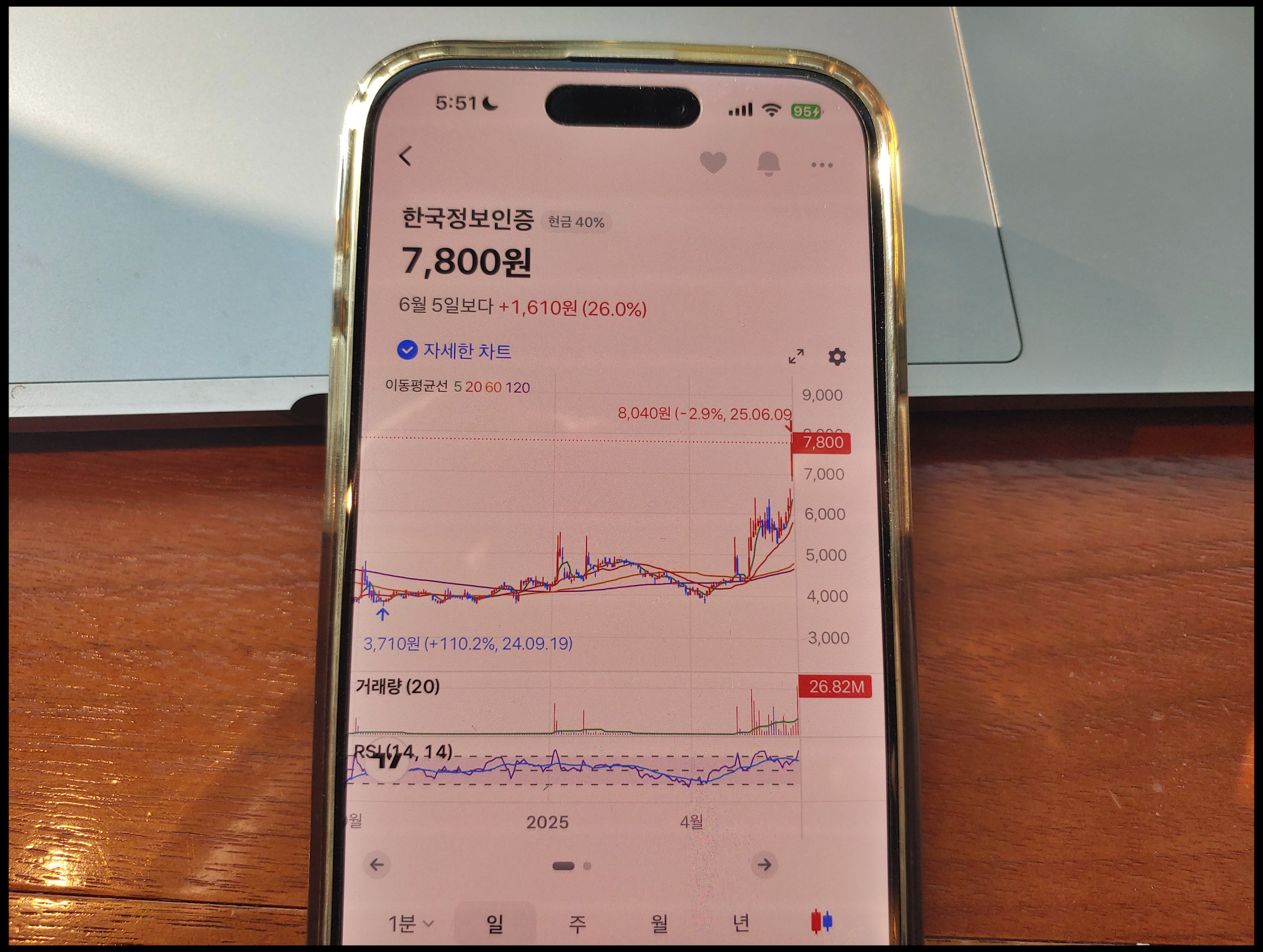 (1) 한국정보인증 : 6월 9일 7,800원(+26.01%)