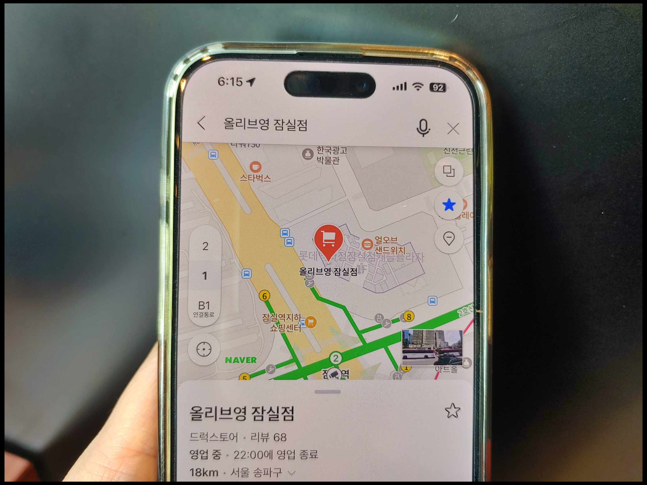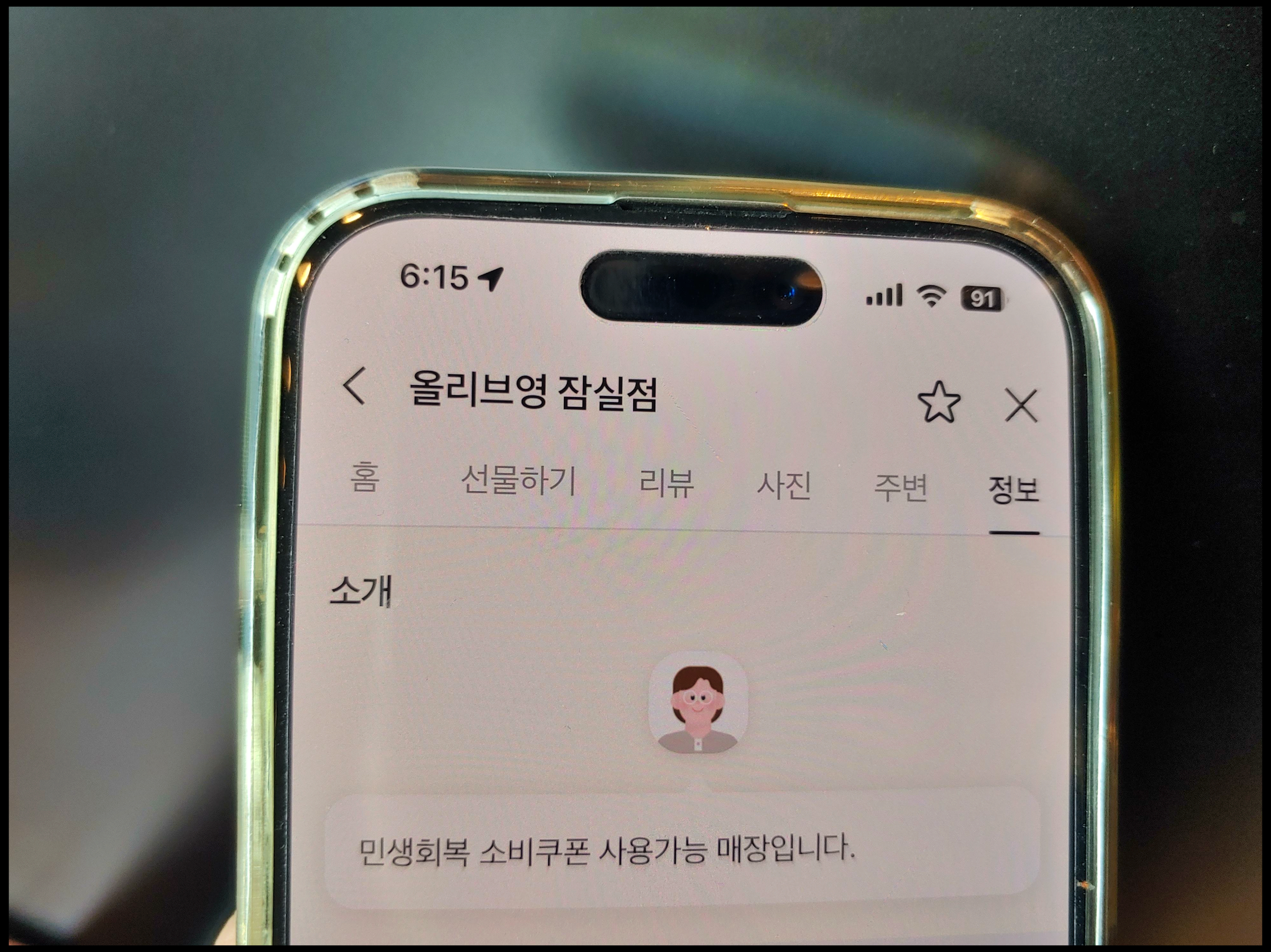 [사진 = 올리브영 가맹점 찾기 네이버 지도 앱 활용하는 방법이 있습니다. 해당 앱에서 올리브영 잠실점 검색했더니 정보 항목에 '민생회복 소비쿠폰 사용가능 매장입니다.' 문구가 있습니다. 만약 자신이 방문하고 싶은 올영 매장에서 올리브영 민생지원금 사용 여부 파악하려면 이러한 형태도 가능합니다. 어쩌면 이러한 방법은 다른 프랜차이즈 매장도 비슷하게 가능하지 않을까 싶은데, 다이소는 정보 항목이 아닌 그림에서 사용 가능 여부가 뜨는 차이점이 있습니다. 그림이 안뜨는 곳은 사용되지 않는 곳입니다. 여기서 다이소 언급한 것은, 많은 분들이 올영과 함께 해당 지원금 사용 여부 궁금하게 여기는 곳이기 때문입니다. (C) 네이버 지도 앱]