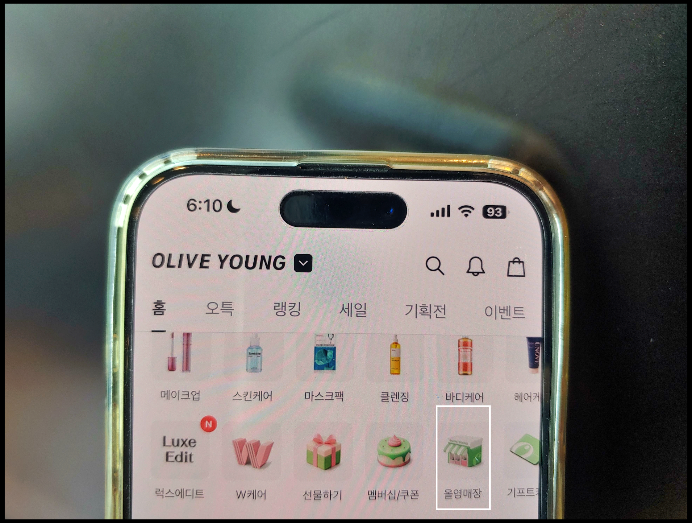 올리브영 가맹점 찾기 또 다른 방법이 있습니다. 올리브영 모바일 앱 메인에 '올영매장'이 있습니다.(PC 버전은 상단에는 '올영매장찾기'에 있는데 로그인해야 함) 자신의 현재 위치 근처에 있는 올영매장 찾을 수 있으며, 전국 올영매장 위치 파악 가능합니다.