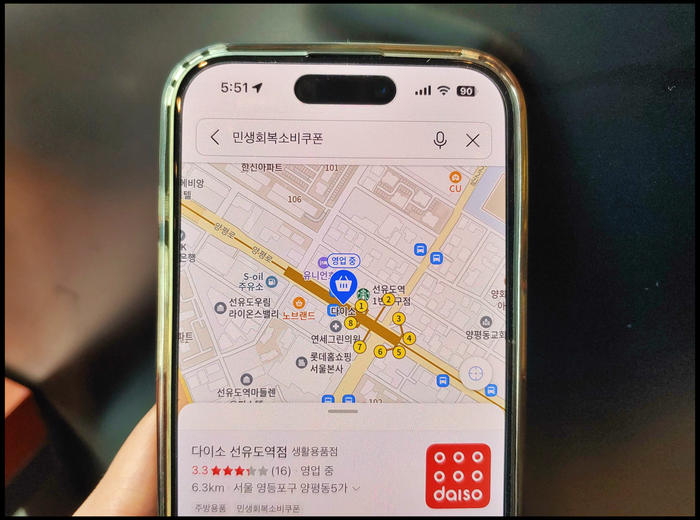 [사진 = 민생회복지원금 사용 가능한 곳 카카오맵에서 쉽게 찾을 수 있습니다. 현재 해당 앱 메인에 '소비쿠폰' 메뉴가 뜹니다. 자신의 현재 위치 또는 특정 지역에서 해당 지원금 쓸 수 있는 상점들이 나옵니다. 다이소 가맹점도 뜹니다. 만약 매장 정보에 '민생회복 소비쿠폰'이라고 되어 있는 매장이 있다면 사용 가능하다고 보시면 됩니다. (C) 카카오맵 앱]
