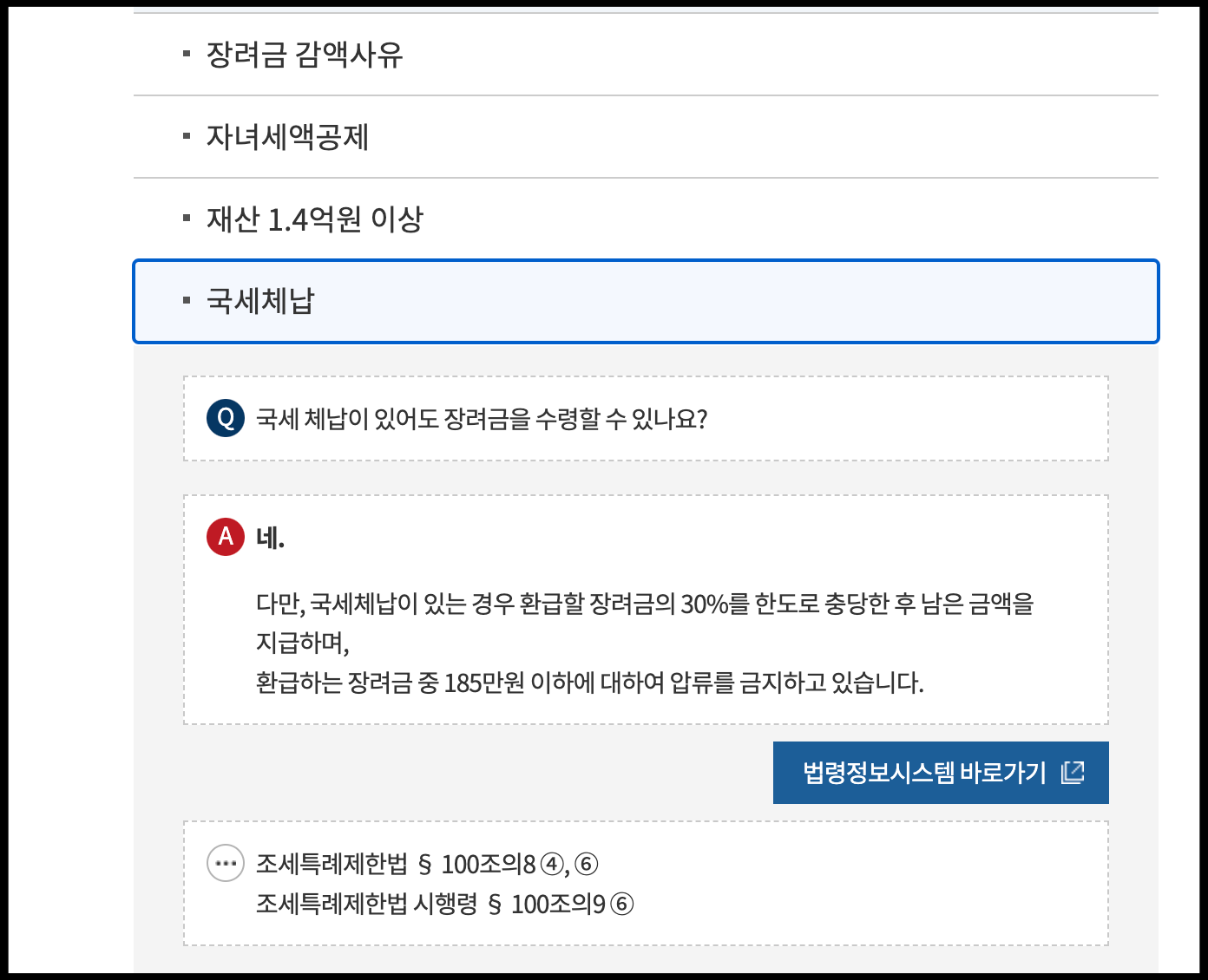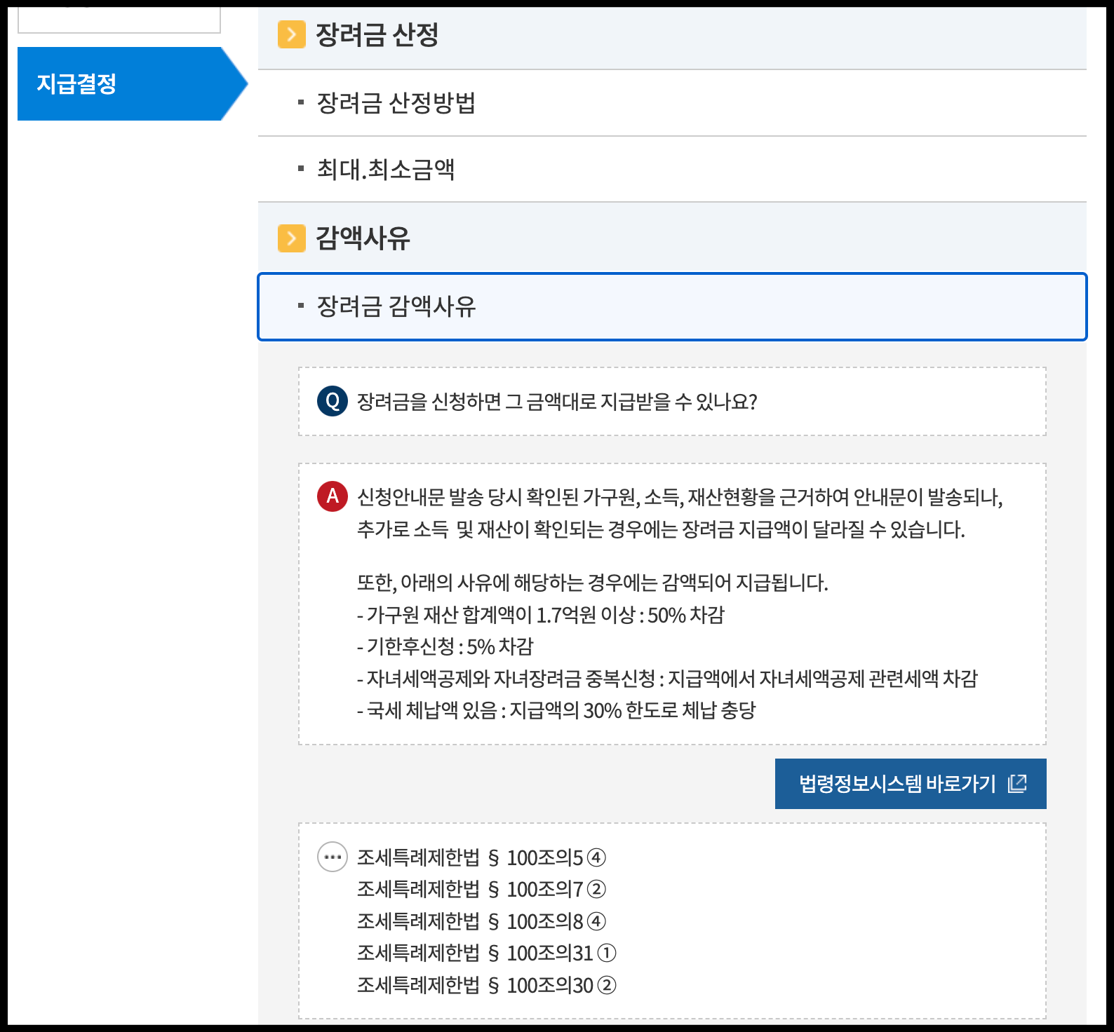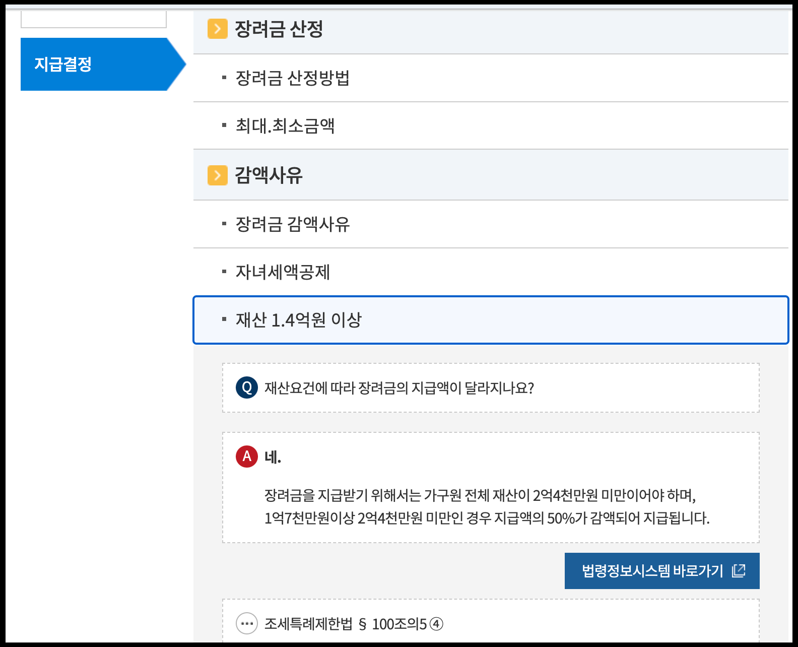 -재산 합계액 1억 7천만 원 이상 ~ 2억 4천만 원 미만 : 산정된 장려금의 50%만 받을 수 있음