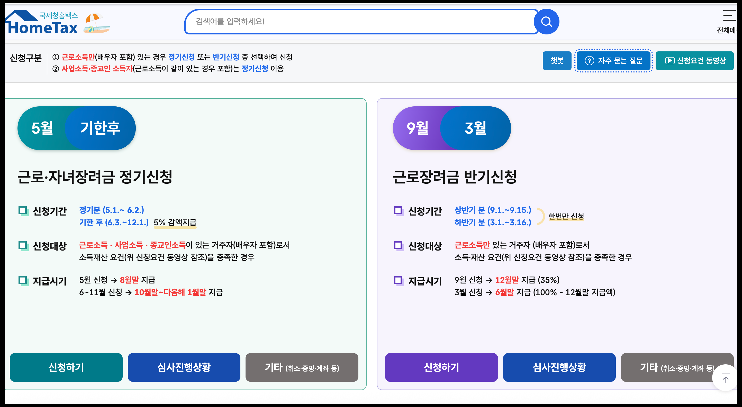 [사진 = 현재 시점에서는 근로 및 자녀장려금 기한 후 신청 가능합니다. 기한 후 신청은 오는 12월 1일까지이나 5% 감액 지급됩니다. 오는 10월 말부터 2026년 1월 말에야 지급됩니다. 한편, 근로장려금 반기 신청 기다리는 분도 있을 겁니다. 오는 9월 1일부터 15일까지 상반기 분 신청된다고 합니다. 근로소득만 있는 분(배우자 포함)이 해당되며 소득 및 재산 요건 충족되어야 합니다. 만약 9월에 신청하셨다면 12월 말 지급됩니다.(35%) (C) 국세청 홈택스 홈페이지]