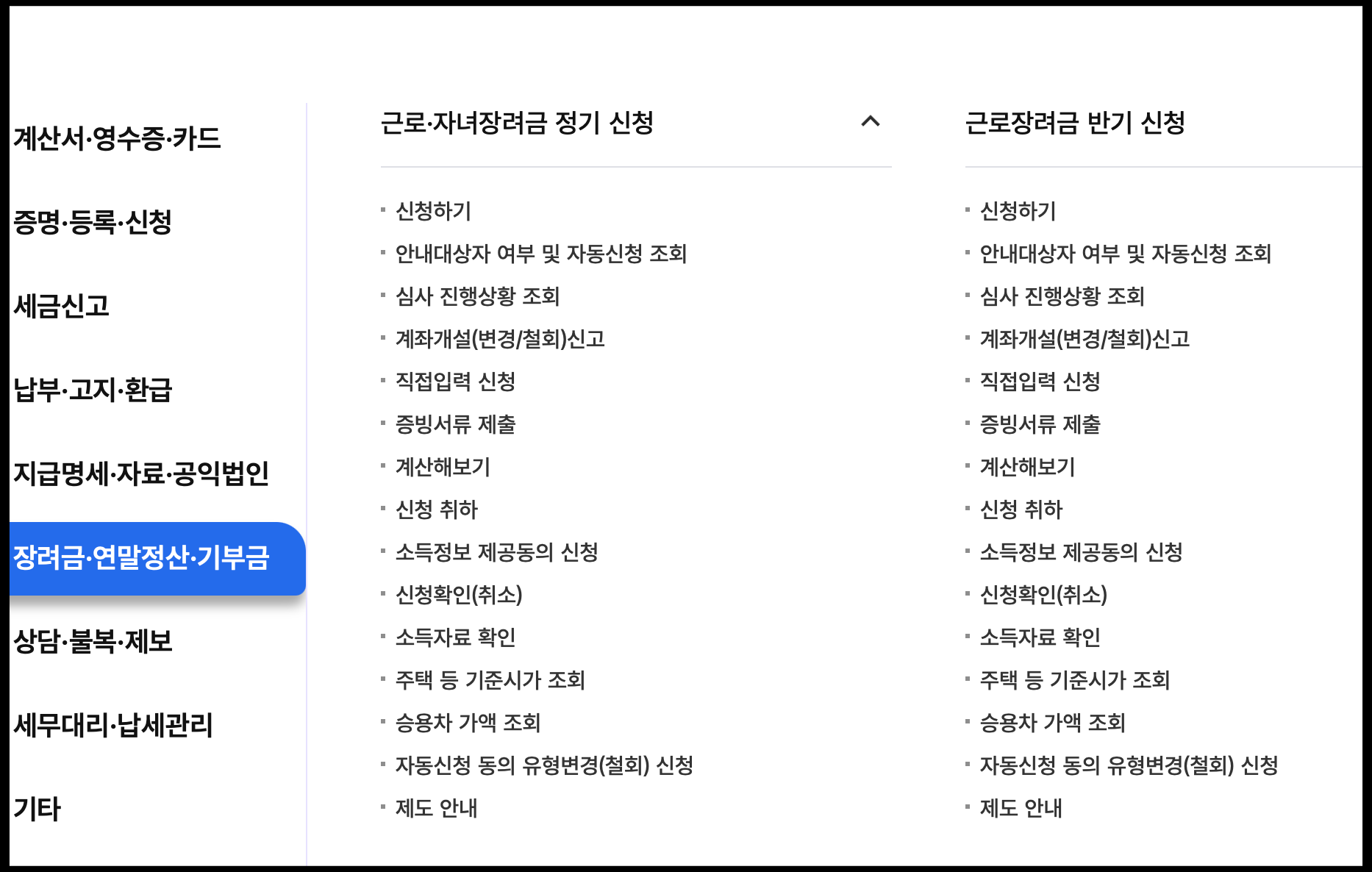 [사진 = 근로장려금 정기 신청은 근로소득, 사업소득, 종교인 소득 있는 분만 받을 수 있습니다. 만약 사업자 및 종교인이 아닌 분이라면 근로소득이 있는 분만 해당 장려금 받을 수 있다고 보시면 됩니다. 반면 반기 신청은 근로소득 있는 분만 해당되며 신청 시기가 정기와 다릅니다. 반기 신청은 오는 9월에 상반기 분 신청 가능하다고 합니다. 9월 1일부터 15일까지이며, 만약 이 때 신청하신 분은 오는 12월 말 지급받을 수 있다고 합니다. (C) 국세청 홈택스 홈페이지]