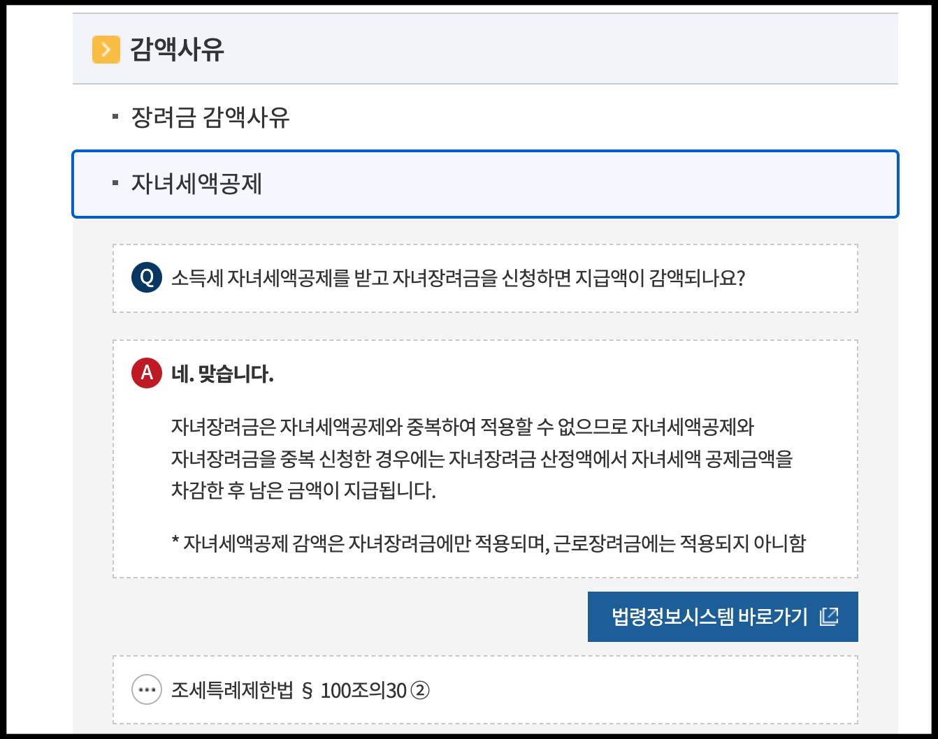 [사진 = 아울러 소득세 자녀세액공제를 받고 자녀장려금 신청 시 지급액이 감액되거나(이것은 둘 다 신청했을 경우를 말함), 국세체납이 있을 경우 환급되는 장려금 30% 한도로 충당된 뒤에 남은 금액 지급된다고 합니다. (C) 국세청 홈택스 홈페이지]
