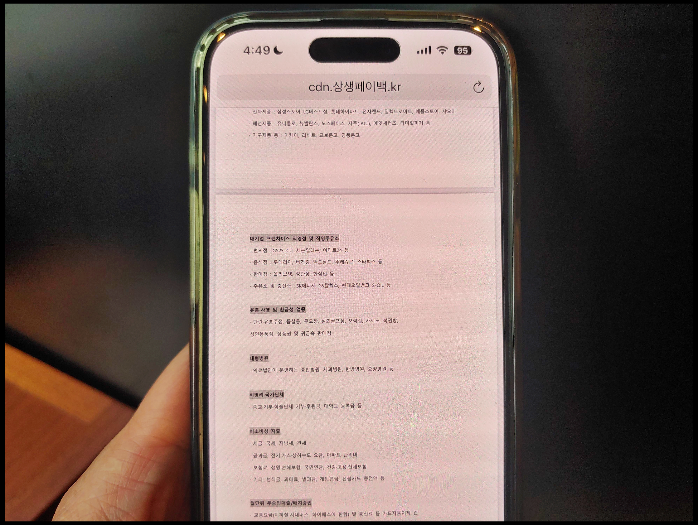 [사진 = 상생페이백 사용처 중에서 소비액 불인정되는 곳은 이렇습니다. 대형마트 및 백화점, 아울렛, 온라인 전자 상거래, 대형 전자제품 등의 직영매장, 대기업 프랜차이즈 직영점(편의점 4사, 맥도날드, 스타벅스 등), 주유소, 교통요금, 통신비 등이 불인정됩니다.