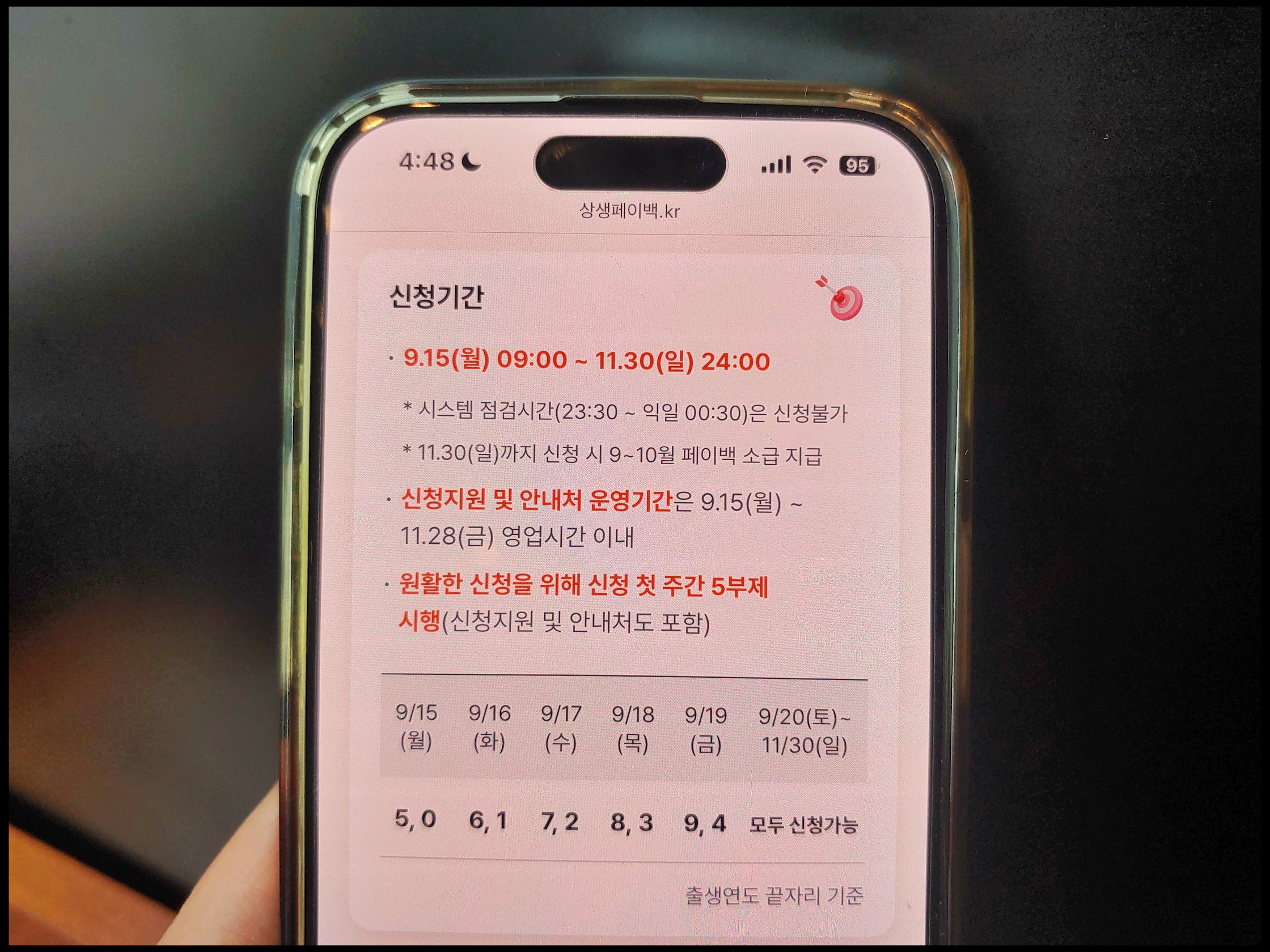 [사진 = 상생페이백 신청 시작일 9월 15일이나 출생연도 끝자리 5, 0인 분들만 가능합니다. 신청 첫 주 평일은 5부제 시행됩니다. 9월 20일부터 11월 30일까지는 5부제 운영되지 않으므로 자유롭게 신청할 수 있습니다. 참고로 시스템 점검기간(23:30 ~ 익일 00:30)은 신청할 수 없다고 합니다. (C) 상생페이백 홈페이지]