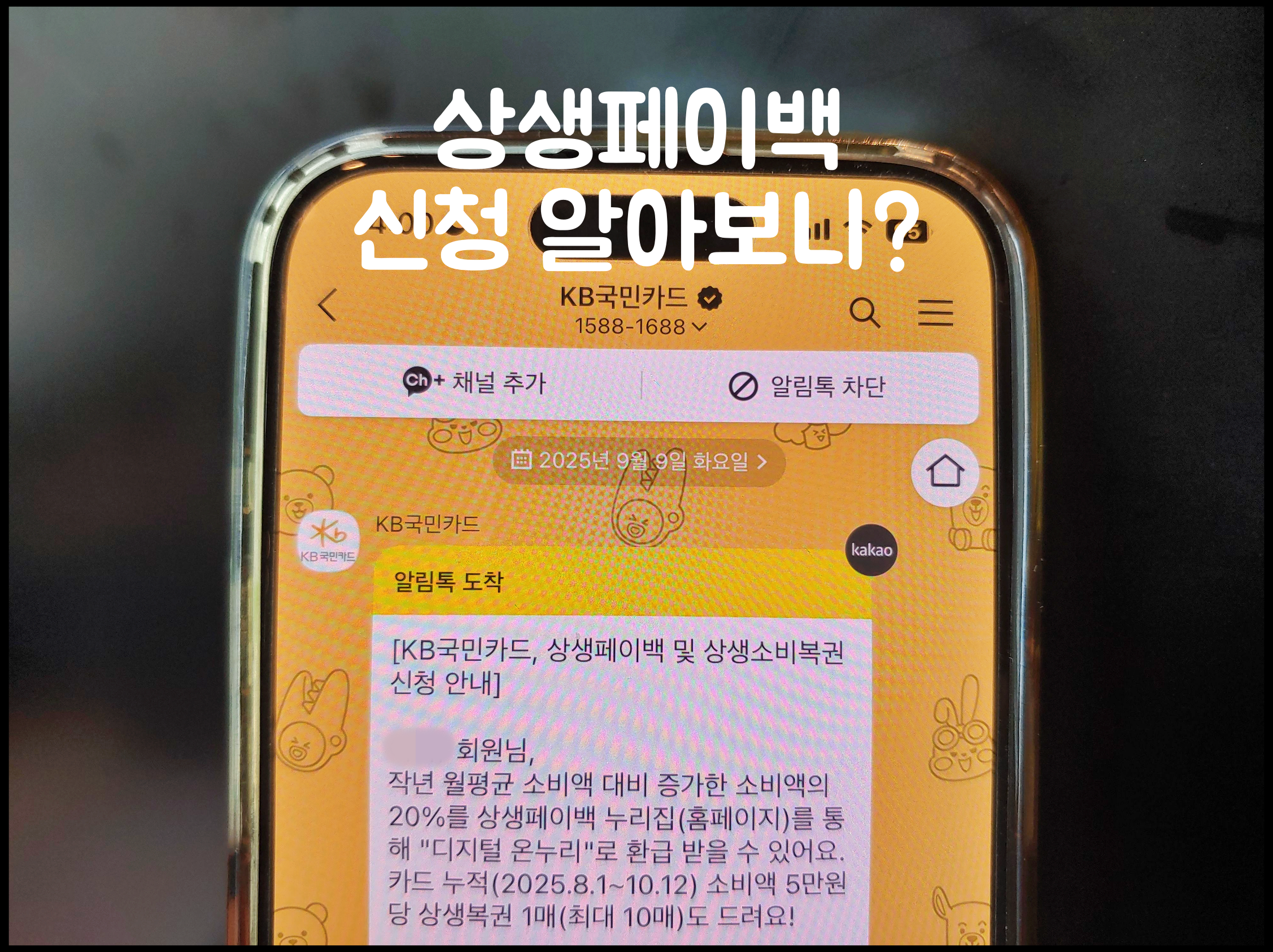 상생페이백 신청 안내 관련하여 KB국민카드에서 저에게 이렇게 카톡을 보냈습니다. 상생페이백이란 2024년 월평균 카드 사용액보다 2025년 9~11월 월별 카드 사용액 증가 시 증가분의 20%를 환급 받을 수 있는 정책입니다. 상생페이백 홈페이지(누리집) 통해서 신청 가능하며, 디지털 온누리상품권으로 환급 받을 수 있다고 합니다. 월 최대 10만 원, 3개월간 최대 30만 원까지 지급됩니다. 또한 상생소비복권 이벤트 응모 기회도 생깁니다. 소비액 5만 원당 상생복권 1매(최대 10매) 지급된다고 합니다. / KB국민카드로부터 받았던 카톡