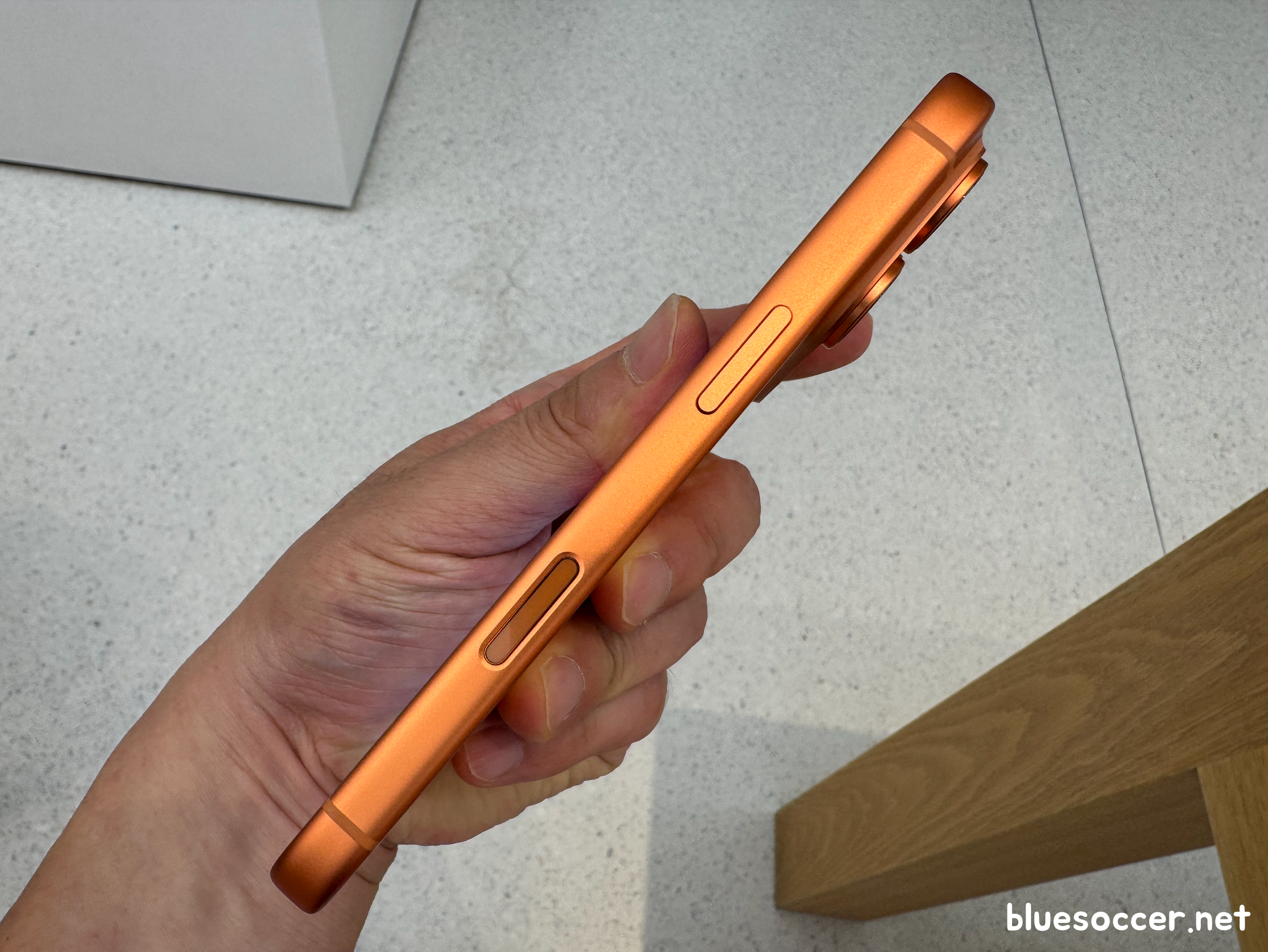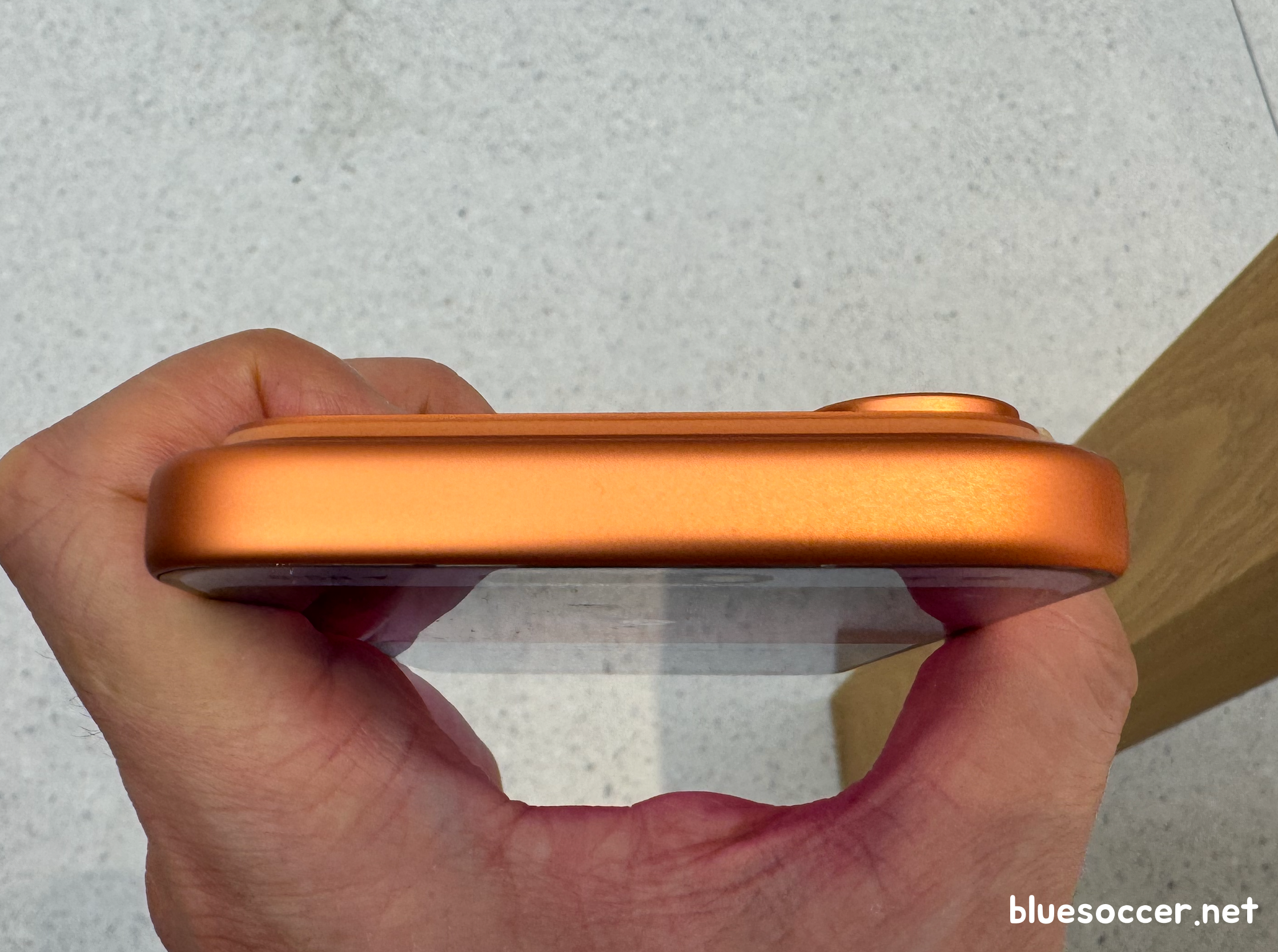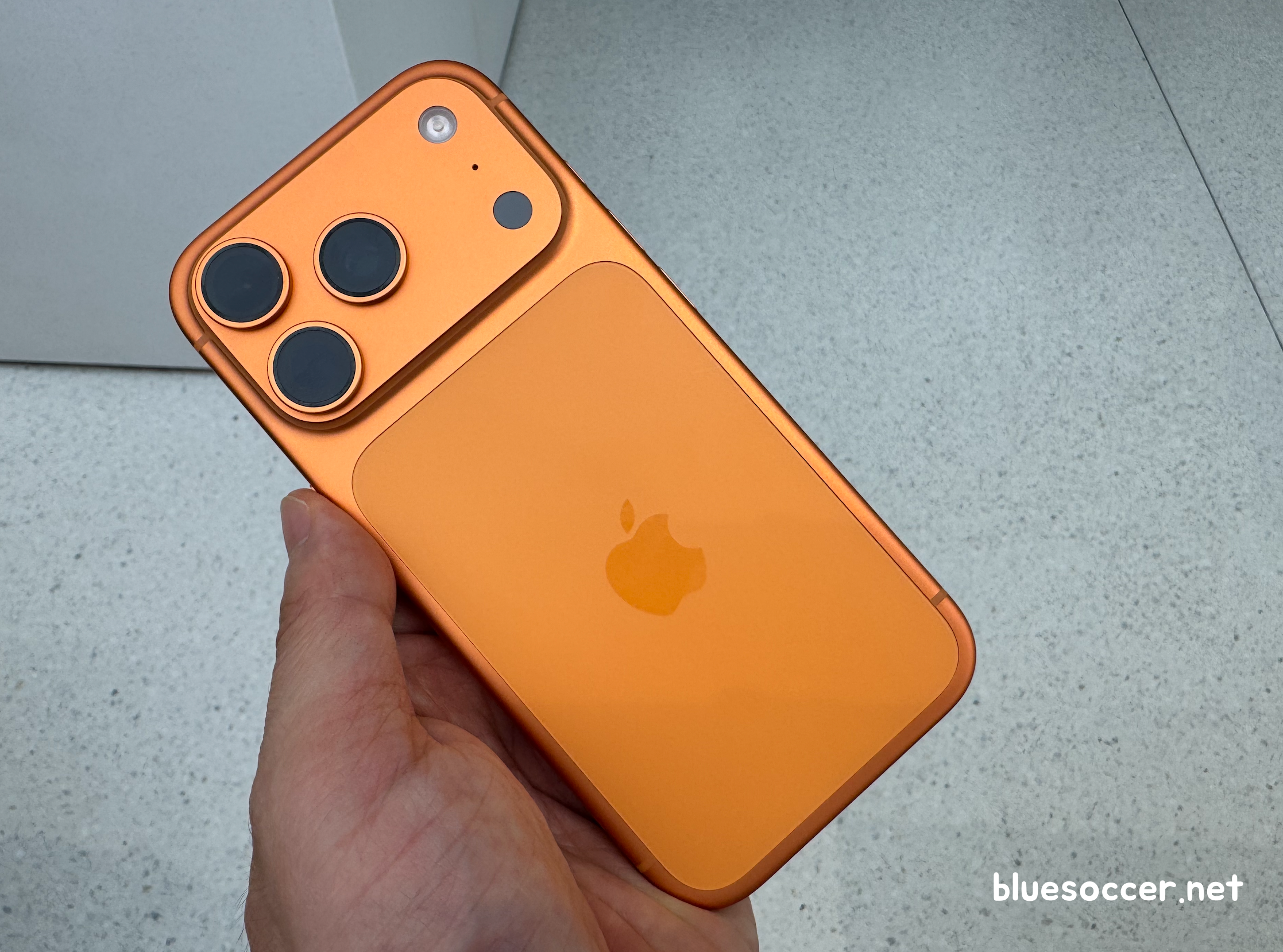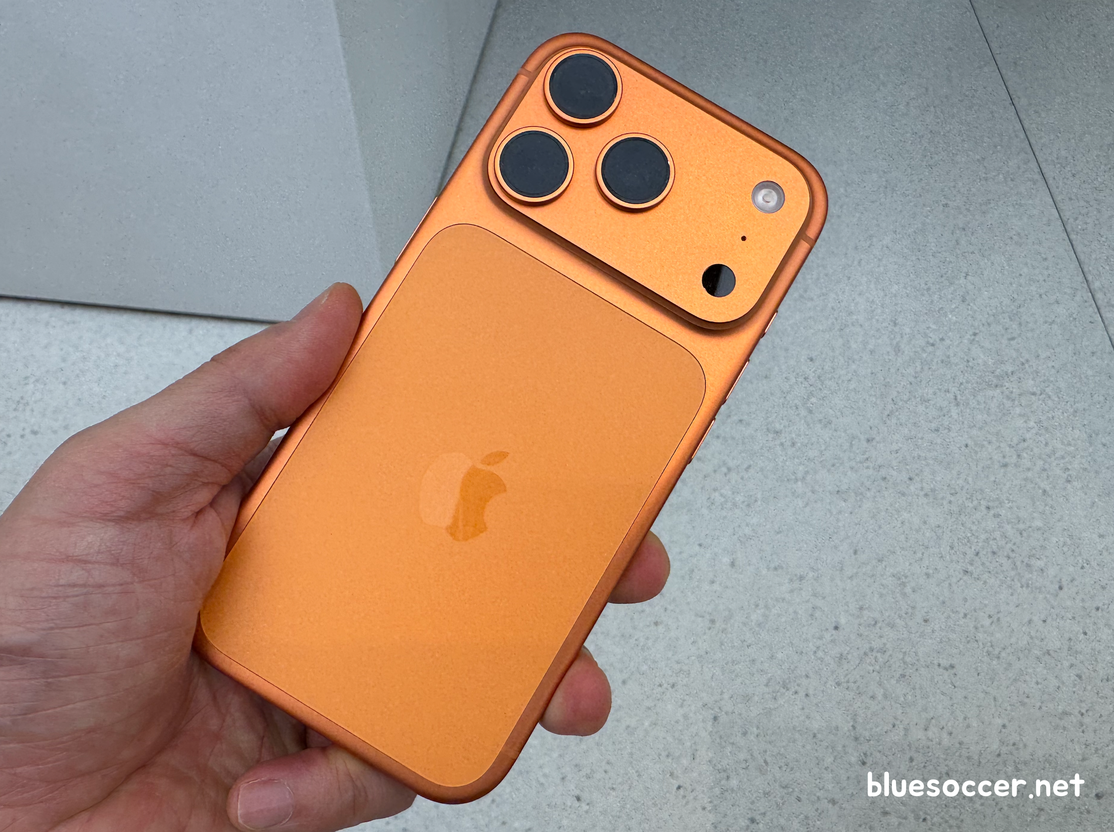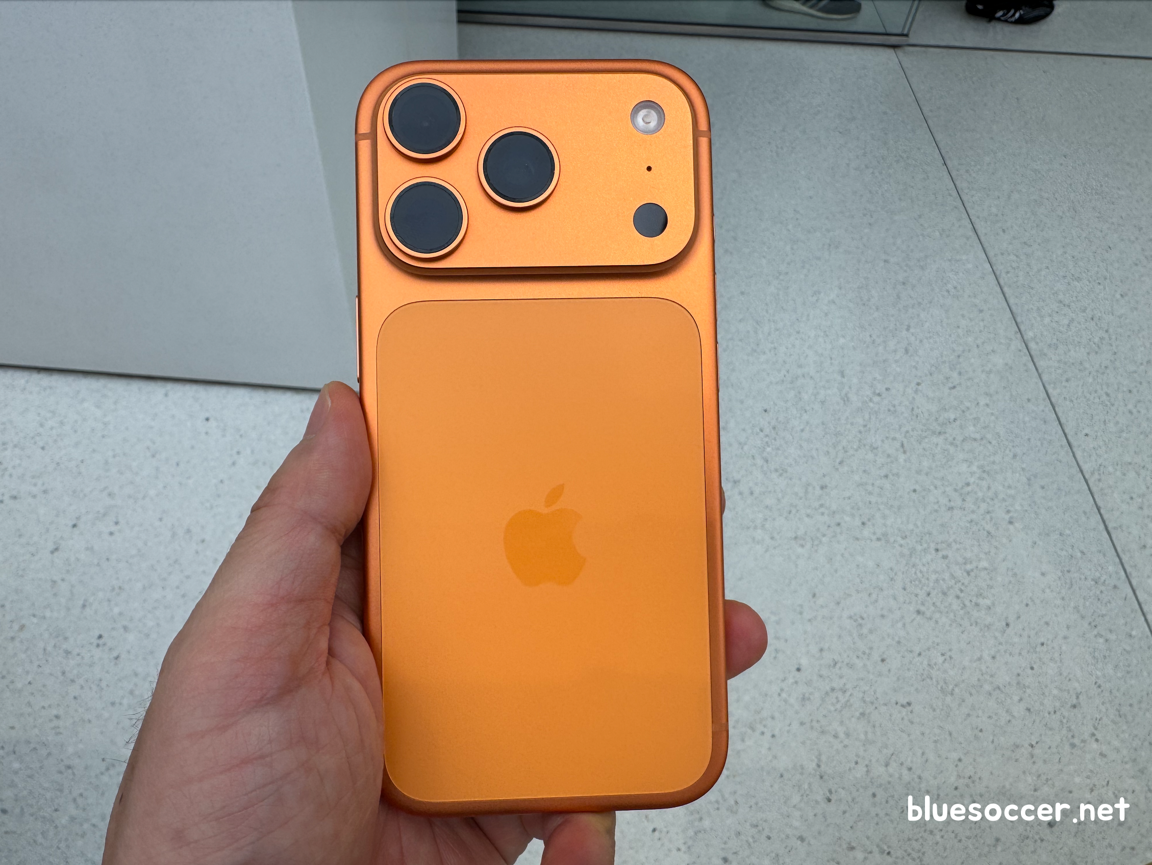 아이폰17 프로 오렌지 색상 모습입니다. 실물을 살펴보니 주황색 진한 톤이 강렬하게 표현됐습니다. 지금까지의 프로 라인업에서 보기 드문 컬러입니다. 이러한 특징 때문인지 애플이 주력으로 밀고 있는 느낌입니다. 오렌지가 실버 및 블루에 비해 '사람들에게 가장 돋보일 수 있는 컬러'라고 판단했기 때문인 것 같습니다.