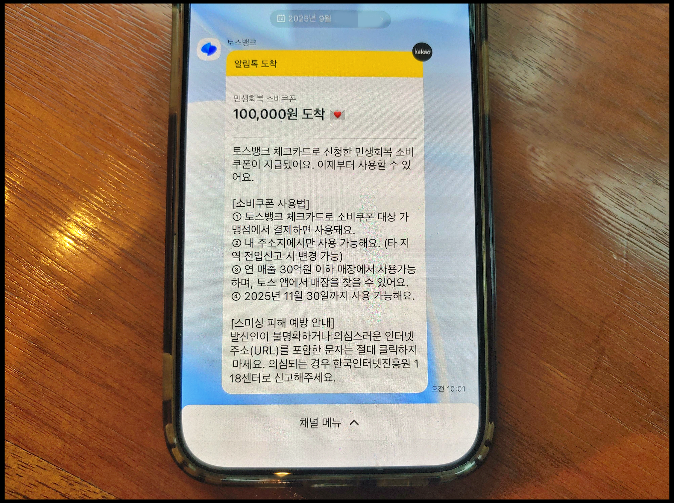 [사진 = 저는 토스로 민생회복 소비쿠폰 2차 신청했는데 다음날 10만 원 지급됐습니다. 소비쿠폰 기한 2025년 11월 30일까지 사용 가능하다고 안내됐습니다. 다른 카드사 앱이나 다른 형태로 신청하셨던 분들도 비슷한 안내 받으셨을 겁니다. 이미 2차 지원금 모두 다 사용하신 분들은 해당사항 없겠지만, 혹시나 지원금이 남아있는 분이라면 이 부분 체크해야 할 듯합니다. (C) 토스뱅크 카톡]