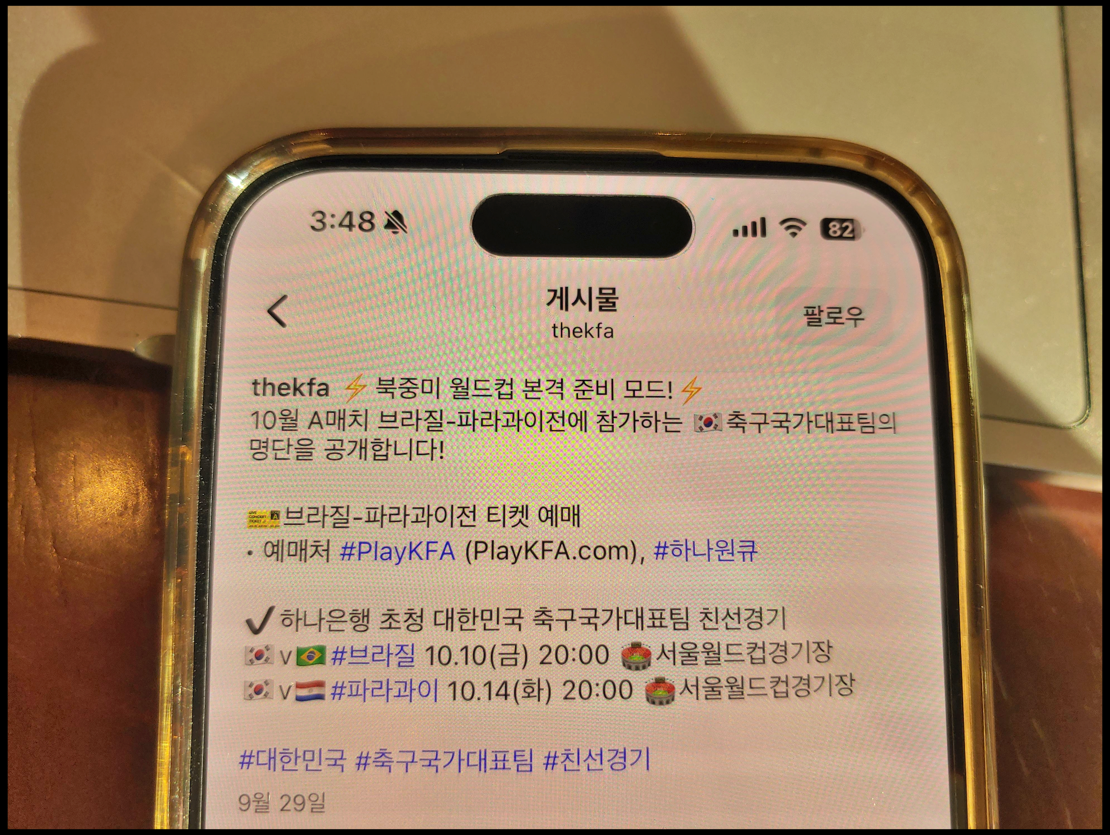 [사진 = 한국 축구 대표팀의 10월 A매치 2경기 상대팀은 남미에 속했다. 서울 월드컵 경기장에서 오는 10월 10일 브라질전, 14일 파라과이전을 치른다. 브라질은 2026 북중미 월드컵 남미 예선 5위, 파라과이는 6위를 기록하며 본선 진출에 성공했다. 남미는 본선 진출 직행 6장, 플레이오프 1장 배정된다. 예선 7위 기록했던 볼리비아는 오는 11월 14일 한국과 국내에서 A매치 평가전을 치를 예정이다.(장소 추후 확정) (C) 대한축구협회 공식 인스타그램]