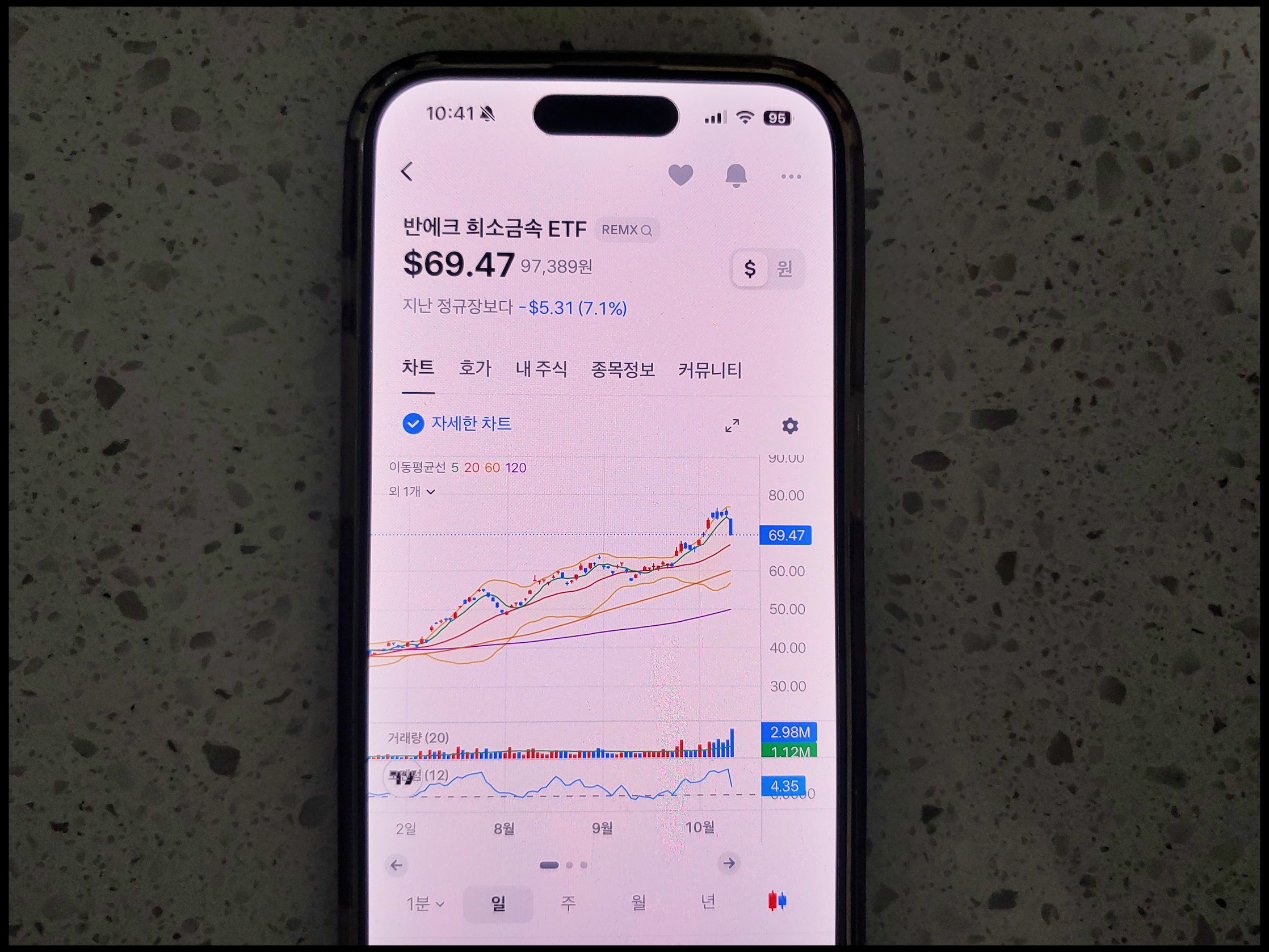 [사진 = REMX ETF는 희토류 관련주 종목입니다. 정확히는 MP 머터리얼즈 구성 비중이 가장 높은 희토류 및 리튬 등의 전략자원 관련 ETF 입니다. 10월 10일에는 7.1% 하락했습니다. 하지만 지금까지 끊임없이 올랐던 종목입니다. 10일 하락은 차익 실현 가능성으로 추측됩니다. (C) 토스 앱]