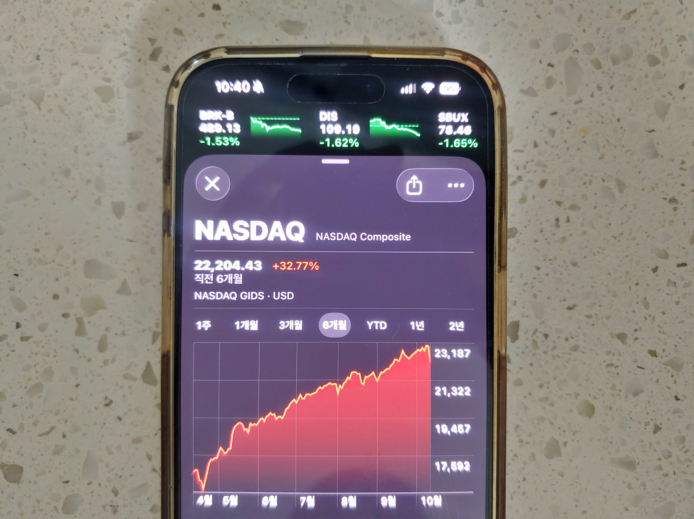[사진 = 10월 10일 미국 나스닥 지수 3.56% 하락했습니다. 하루에 이렇게 많이 빠졌던 날은 근래 없었습니다. 지난 4월 관세 여파 이후 6개월 동안 상승 추세가 계속되었으며, 그 사이에 1% 정도 조정이 왔던 날도 있었으나 어느 순간이 되면 다시 오르고 또 올랐습니다. 미국 중국 관세 분쟁이 다시 재현되면서 미국주식 및 가상화폐 불확실성이 나타났습니다. 주식 시장에서는 트럼프 1기 집권 시절을 떠올렸는지 수많은 매물들이 쏟아지면서 하락을 초래했습니다. (C) 아이폰 주식 앱]