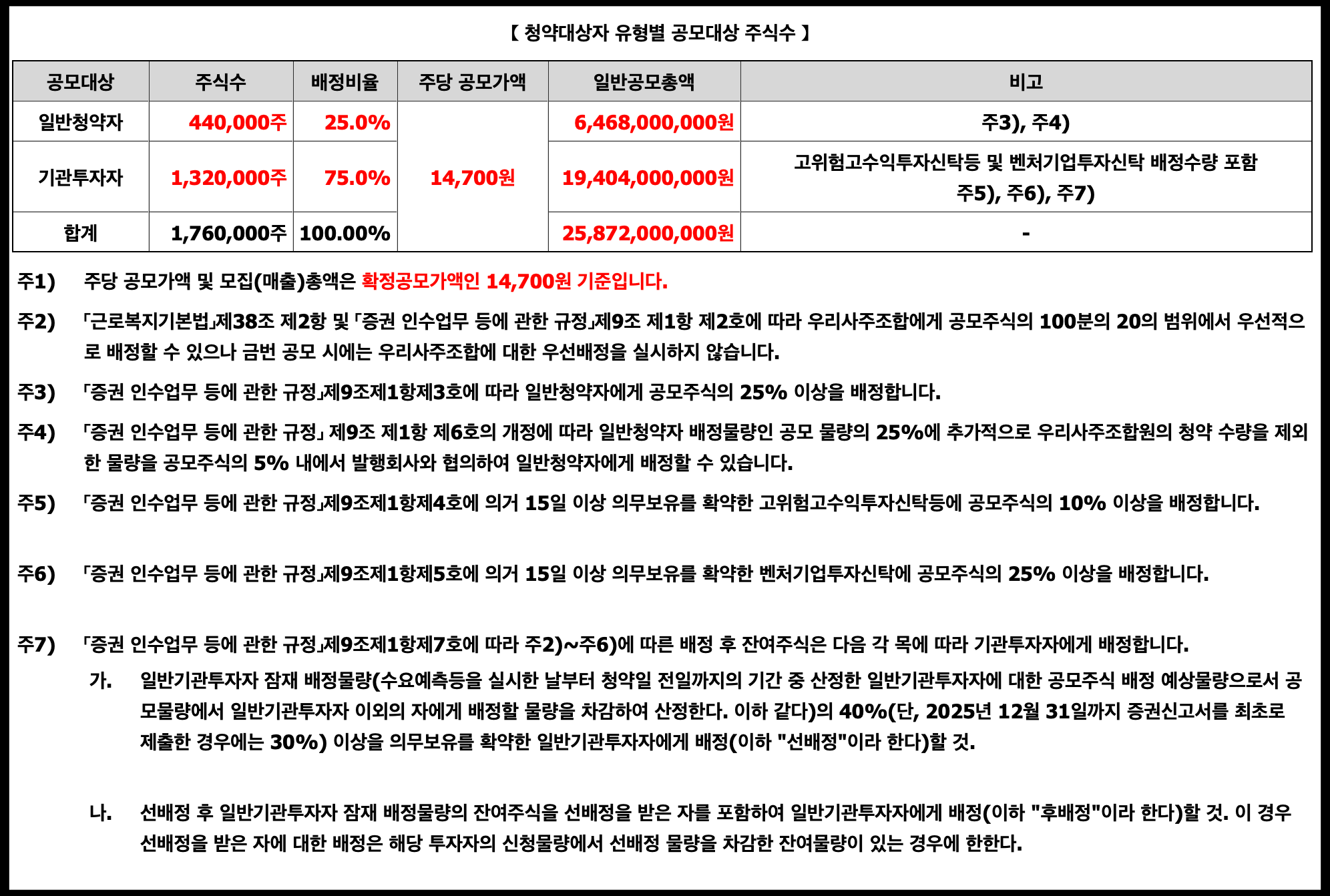 공모금액 : 공모주식(1,760,000주) x 공모가(14,700원) = 259억 원