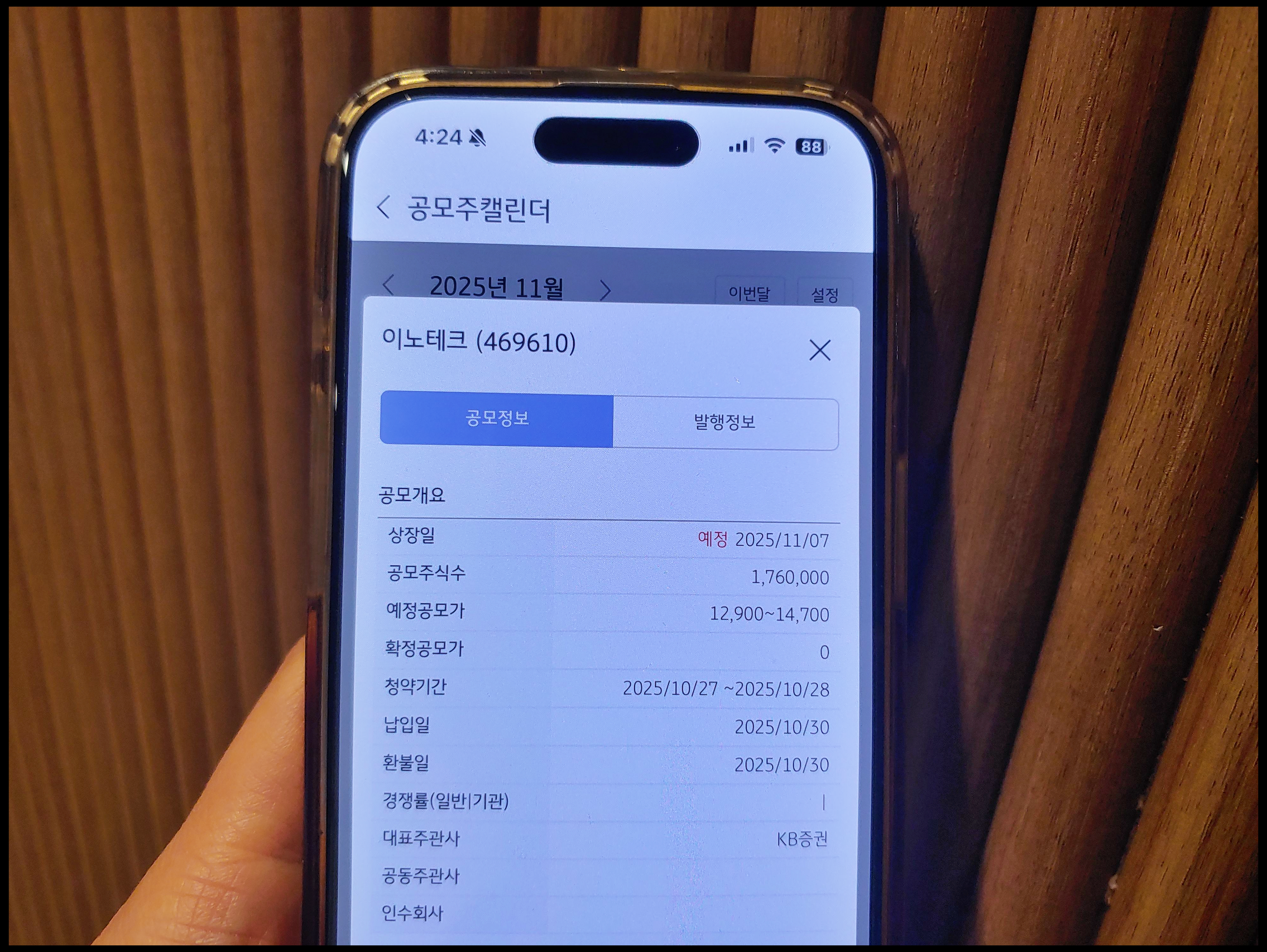 [사진 = 이노테크 공모주 청약일정 10월 27일과 28일 이틀 동안입니다. 다음날 29일에 균등 배정 여부가 안내되며 남은 금액 30일에 환불됩니다. 상장은 오는 11월 7일 예정이며 단독 상장입니다. 이노테크 수요예측 결과 잘 나오면서 일반 청약자 분들의 관심이 높을 것으로 예상됩니다. 이 회사의 매출이 잘 나오는 영향이 큽니다. 아울러 오는 11월에는 10개 이상의 공모주 종목이 등장할 예정입니다. 일반 청약자들이 분주할 시간이 점점 다가오는 중입니다. (C) KB증권 앱]
