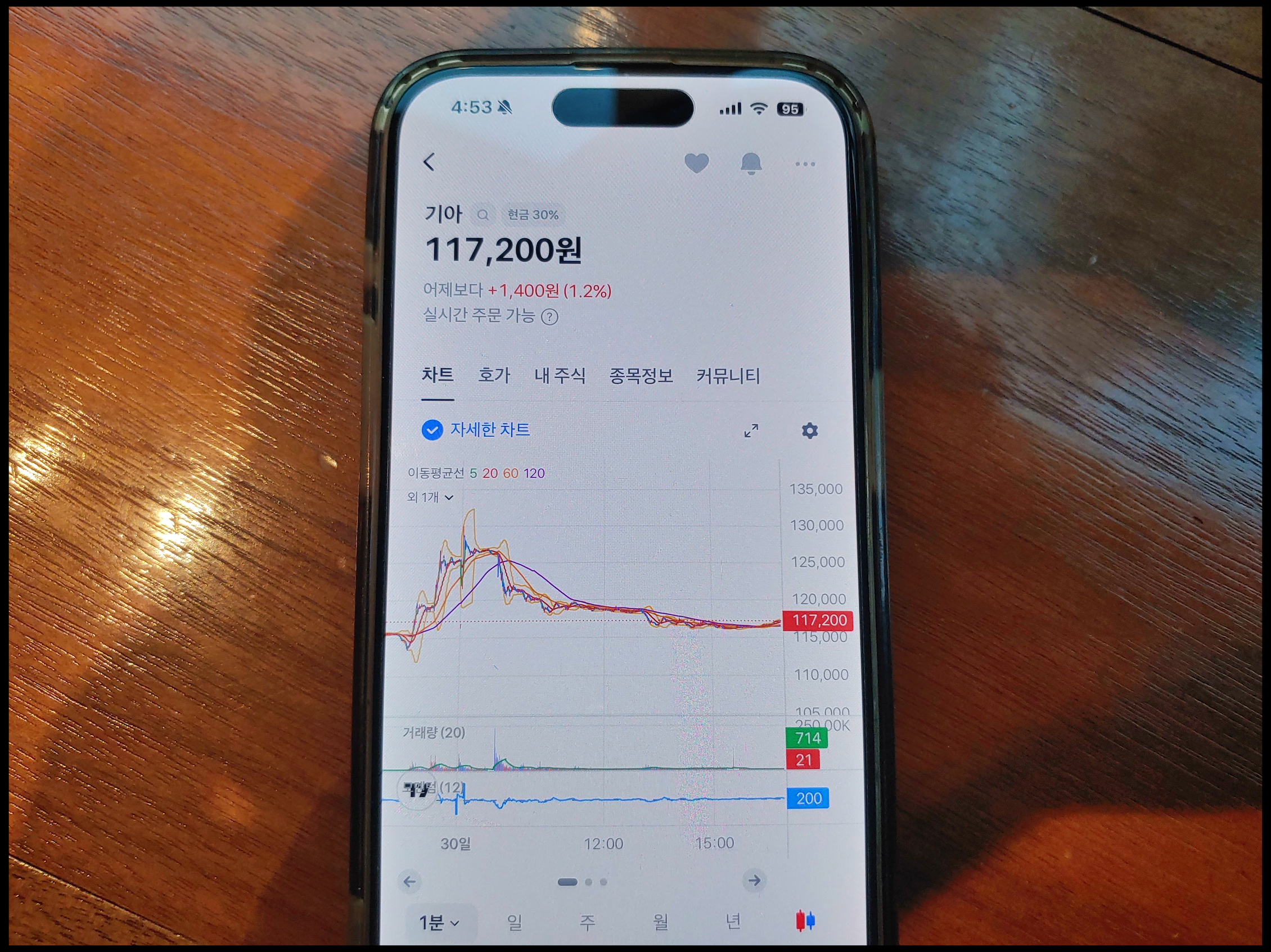 현대차 하면 기아를 빼놓을 수 없습니다. 한미 관세협상 결과 나온 뒤에 급등했다가 다음날 오전에 고점을 형성한 뒤, 차익 실현 매물이 나왔습니다. 현대차와 같은 추이를 나타냈으며, 현대차처럼 거래량 전날보다 3배 많았습니다. 참고로 기아차는 지난 9월 미국 판매량 역대 최고 기록을 세웠습니다. / 사진 (C) 토스 앱