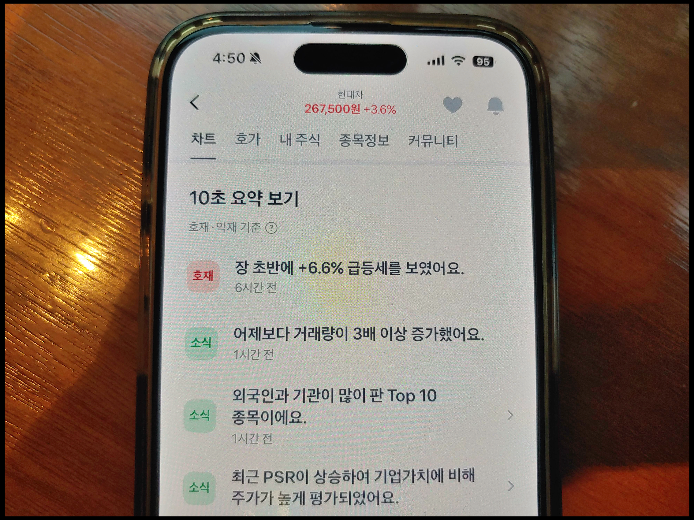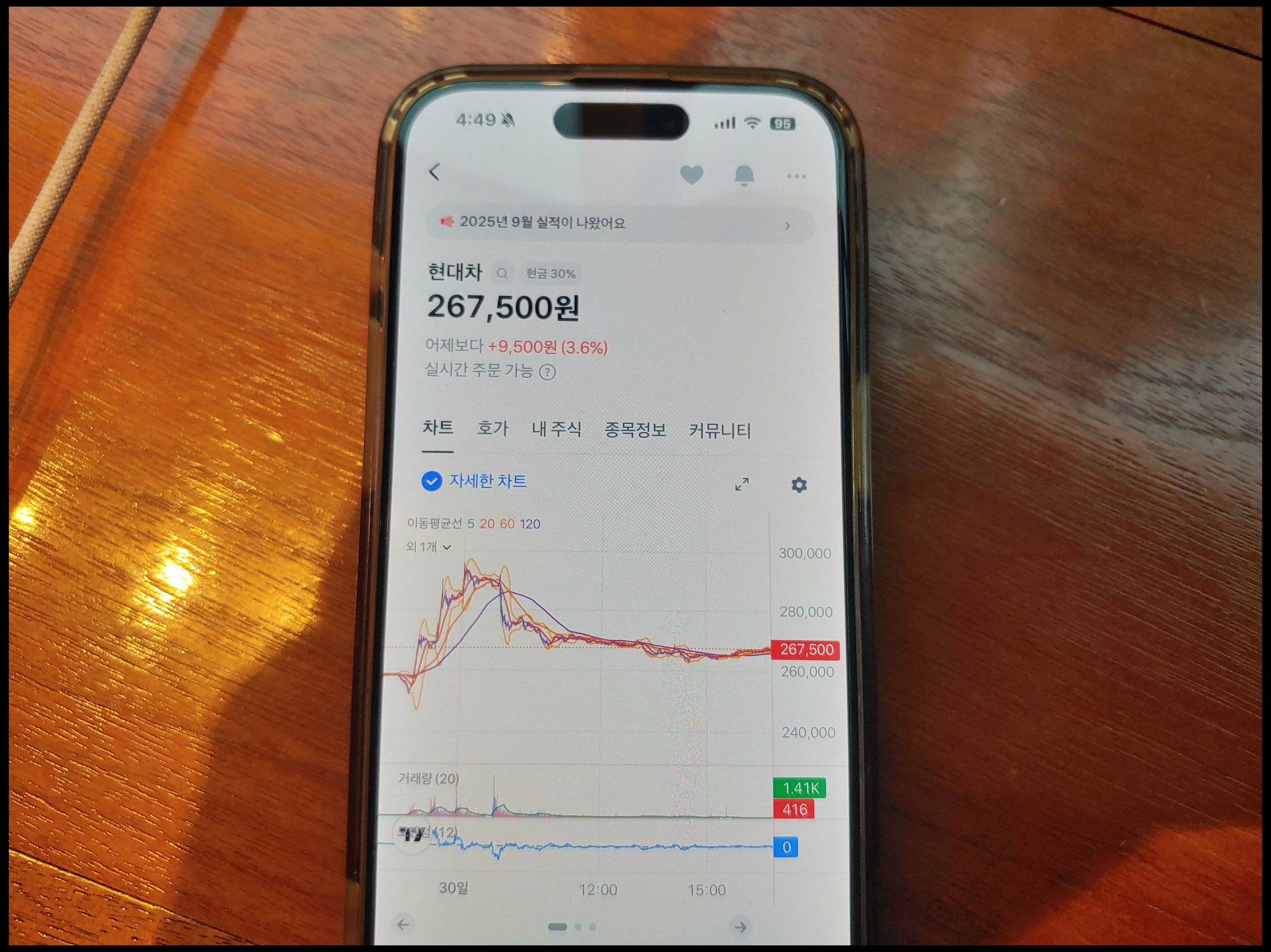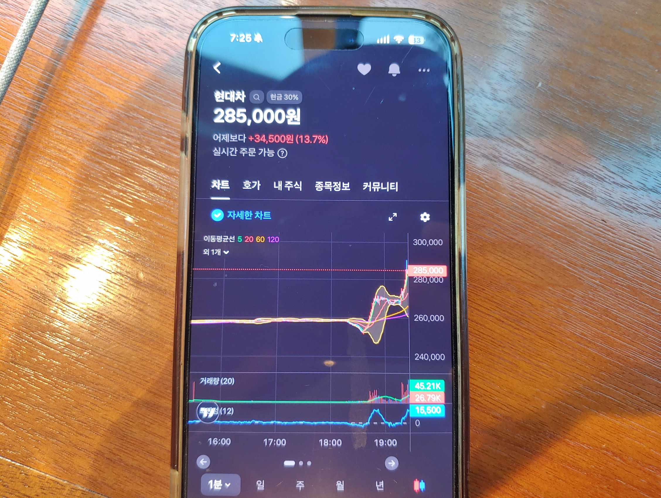 현대차 주가 10월 29일 저녁 6~7시 사이에 한미 관세협상 결과 발표 이후 약 13% 급등했습니다. 오후 7시 25분에는 285,000원까지 치솟았습니다. 자동차 관세 15% 인하 때문입니다. 다음날 오전에는 29만 원대를 뚫었더니 오후 5시 앞둔 현재 26만 원대 후반으로 내려왓습니다. 오전에 차익 실현 매물이 많이 쏟아졌습니다. 거래량이 전날보다 3배 많았으며, 외국인과 기관의 매도세가 강했습니다.(반면 개인은 매수세 뚜렷) 그럼에도 현대차 미국 시장 기대감이 생겼습니다. 앞으로의 주가 추이가 주목됩니다. / 사진 (C) 토스 앱