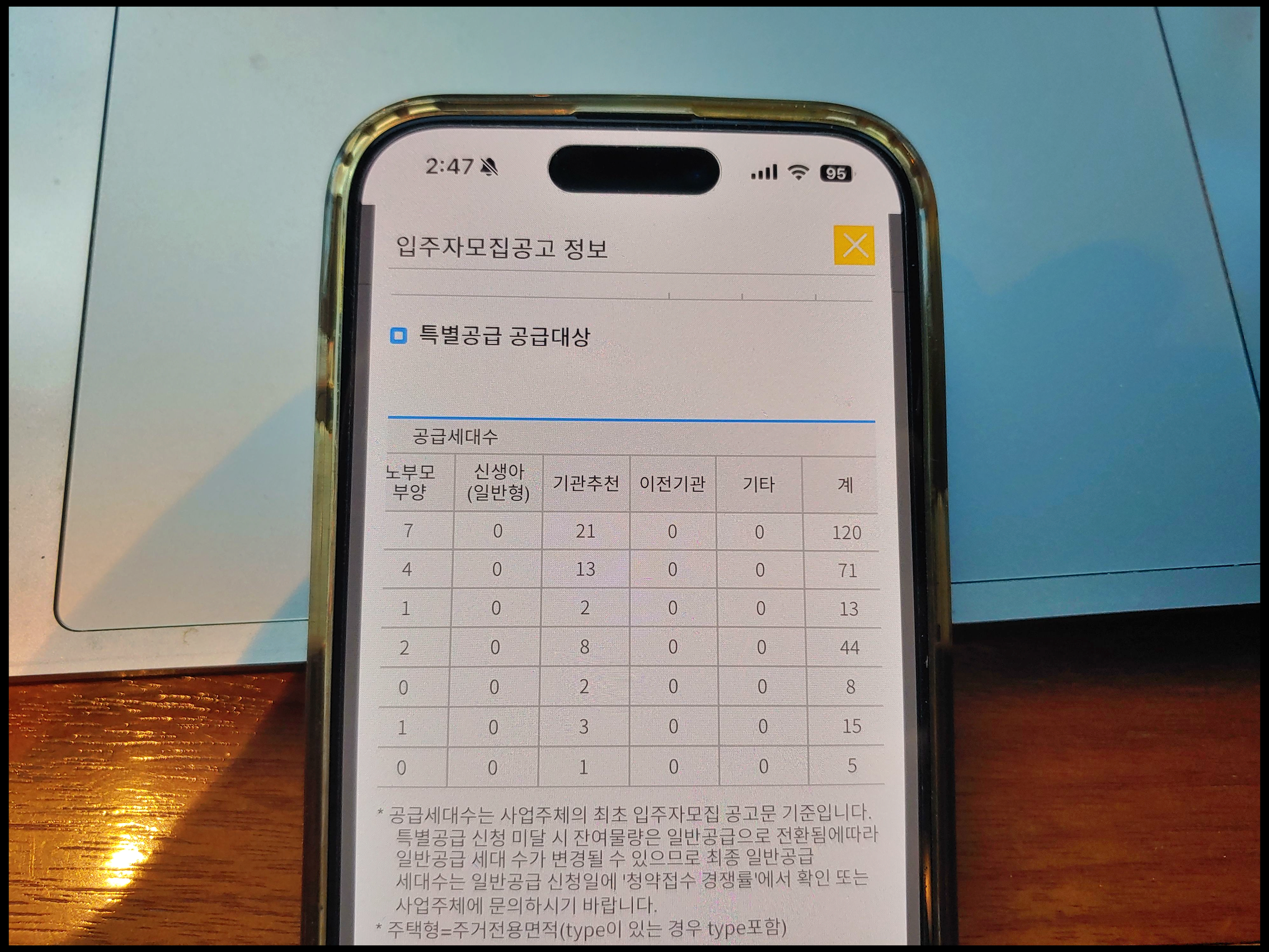 - 청약통장 자격요건 : 특별공급의 기관추천 / 다자녀 가구 / 신혼부부(6개월 이상) 해외건설 근로자(기관추천) / 생애최초 / 노부모부양 / 일반공급 1순위(24개월 이상) 2순위(가입)
