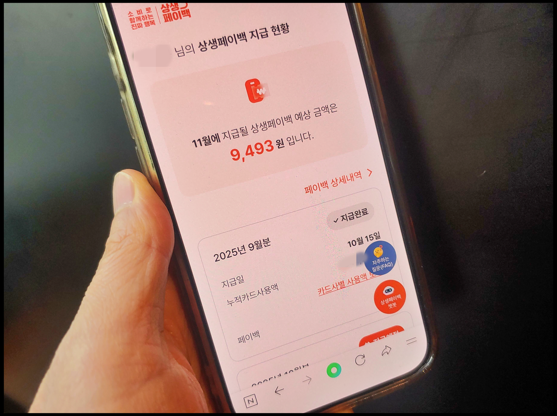 저는 10월 상생페이백 조회 예상금액 파악했습니다. 지난 9월 0원이었는데 10월 9,493원 받을 예정입니다. 드디어 환급 받을 수 있게 됐습니다. 지난 10월에 소비 실적 인정되는 사용처에서 소비된 금액이 2024년 월평균 소비액보다 더 높았습니다. 이제는 사용처에 대하여 충분히 인지했기 때문에 10월 소비액이 더 높게 집계되지 않았나 싶습니다. 그보다는 어느 전자제품 수리를 하면서 돈을 크게 지불했던 것이 소비액으로 실적 인정됐습니다. 물론 이것도 사용처에 따라 다를 수도 있습니다. 소비 실적 사용처 꼭 파악하셔야 합니다. 이제는 많은 분들이 충분히 인지하셨을 겁니다. 2개월 넘게 진행중이며, 이번 11월을 끝으로 운영 마감됩니다. 11월 소비액에 대한 페이백은 12월 15일 지급 예정입니다.