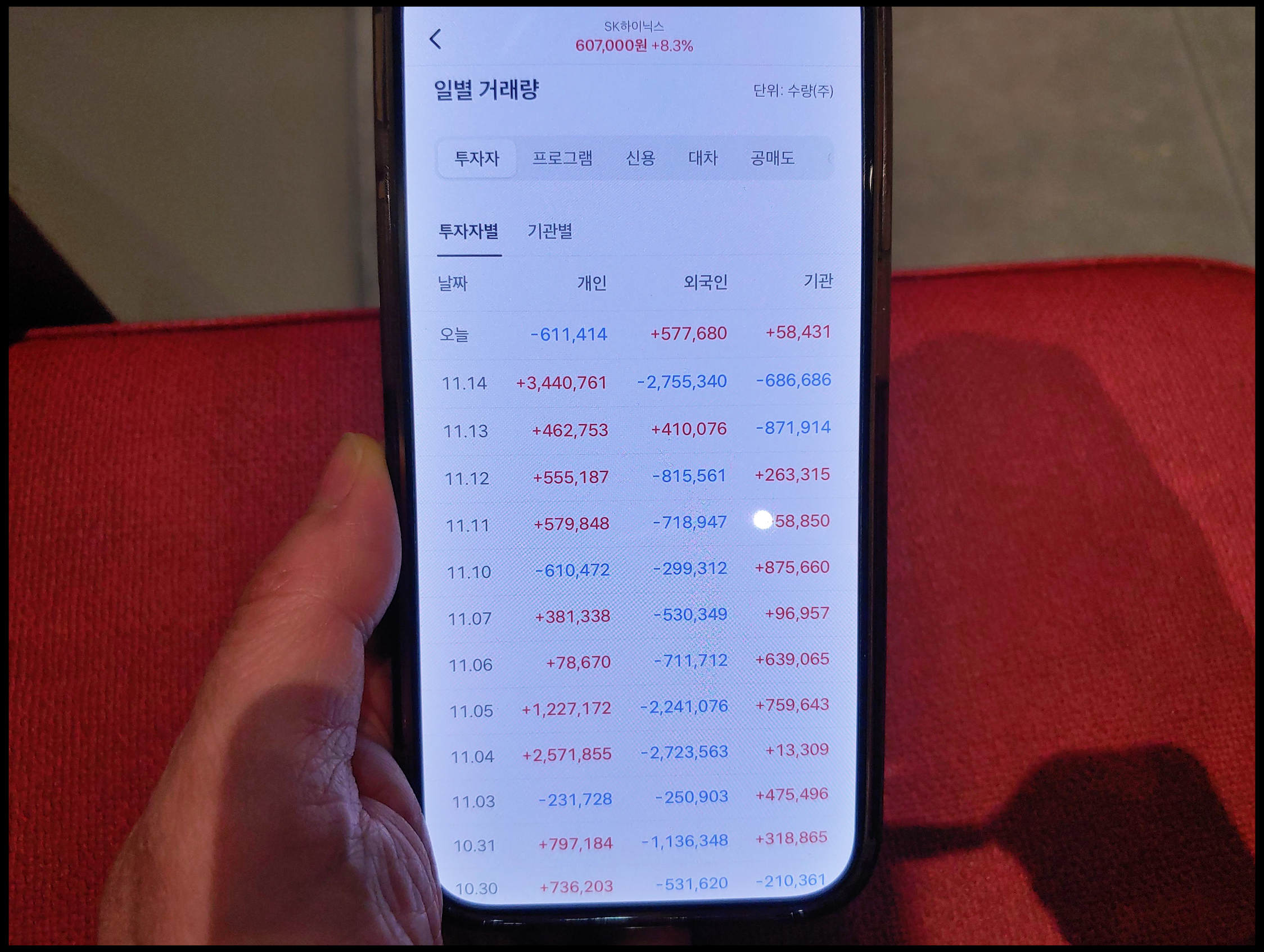 [사진 = SK하이닉스 주가 11월 17일 오후 5시 50분 넘으면서 8% 이상의 상승률 도달했습니다. 전거래일 7.84% 하락을 만회했습니다. 특히 11월 17일에는 외국인 투자자들의 매수세가 두드러졌습니다. 이 종목은 근래 외국인 투자자들의 매도세가 계속되었는데(반대로 기관은 매수세) 11월 13일, 17일에 매수세가 나타났습니다. 어쩌면 엔비디아 실적발표와 연관이 있는 것이 아닌가 개인적으로 추측합니다. 엔비디아 실적발표 이후의 주가 추이가 SK하이닉스와 코스피 지수에 영향을 줄 가능성 있습니다. (C) 토스 앱]