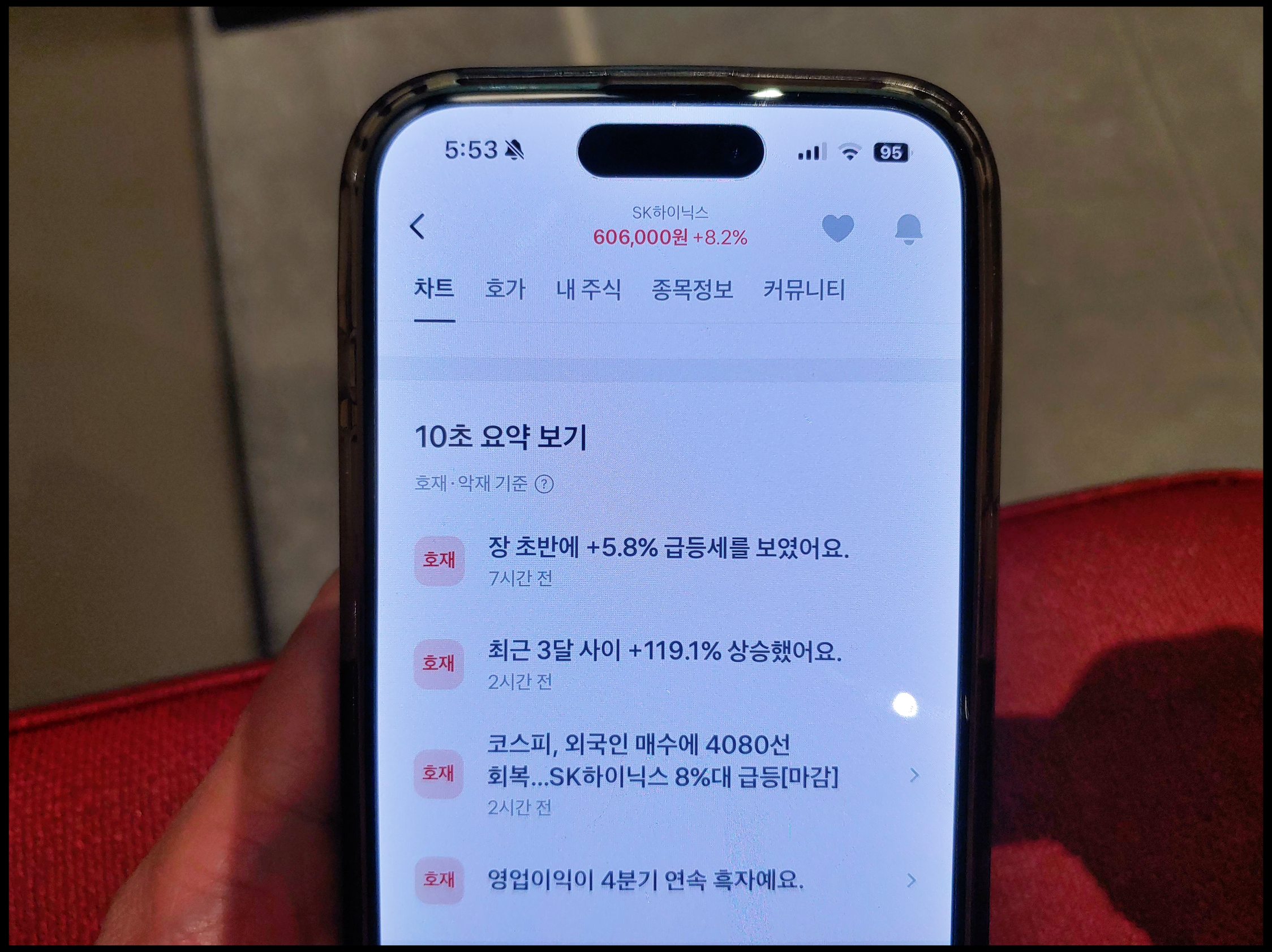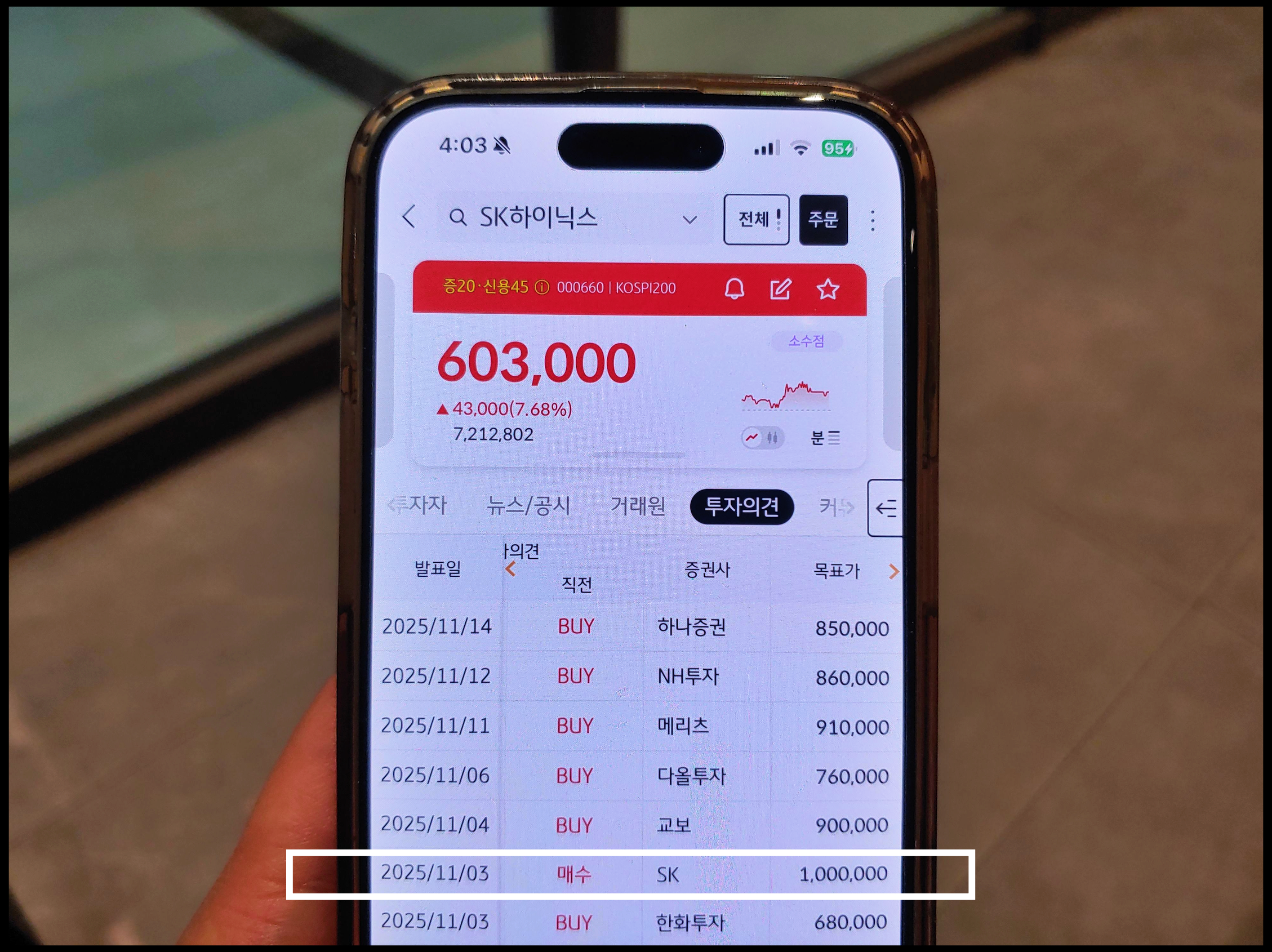 SK하이닉스 목표주가 이번달 증권사 7곳에서 최소 68만원부터 100만원까지의 목표주가 전망치 언급했습니다. 100만원 제시한 곳은 SK증권입니다. 그 이후 2주일 동안 60만원 전후를 오가고 있습니다. 100만원이라는 금액은 현재 주가에 비해 상당히 높게 제시되었음에도 앞으로의 미래 가치를 얼마나 긍정적으로 보는지 알 수 있습니다. 지금 당장은 크게 오르지 않는 종목일 수도 있으나 그 이후의 장기적 가치를 보는 것 같습니다. SK증권 뿐만 아니라 다른 증권사 제시 금액들을 보면 이 종목 가치를 높게 봅니다. 가장 최근 목표주가 85만원이며 하나증권에서 11월 14일 제시했습니다. / 사진 : (C) KB증권 앱