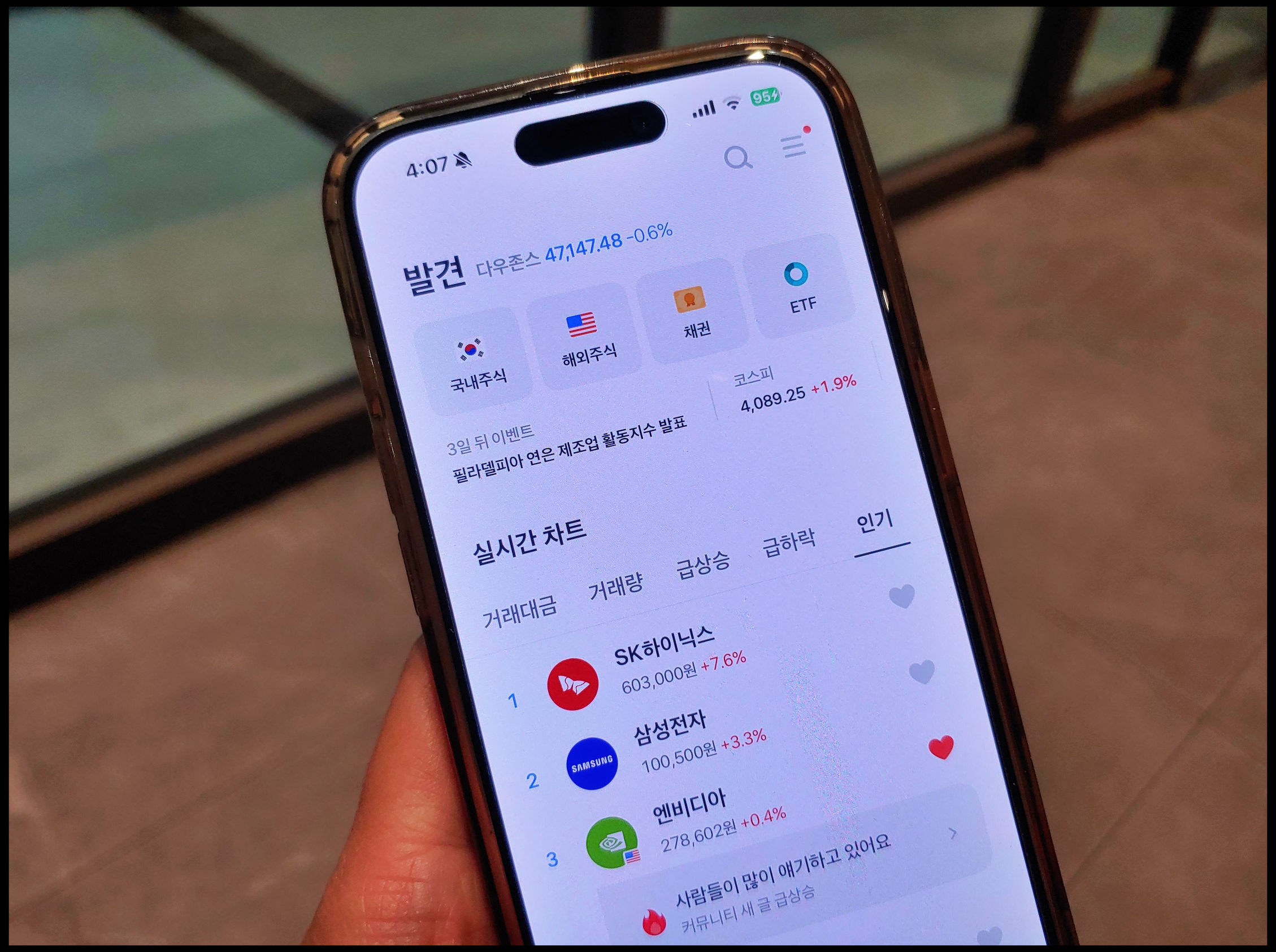 [사진 = SK하이닉스 주가 11월 17일 토스 실시간 차트의 거래대금, 인기 차트 1위 기록중입니다. 7~8% 상승했기 때문입니다. 엔비디아도 최상위권에 포함된 모습을 볼 수 있습니다. 오후 4시가 국장 시간대임을 떠올리면 해외주식 종목이 최상위권 실시간 차트에 올라온 모습을 보면 인기가 높다는 뜻입니다. SK하이닉스 목표주가 흐름에 있어서 엔비디아는 빼놓을 수 없는 관계입니다. (C) 토스 앱]