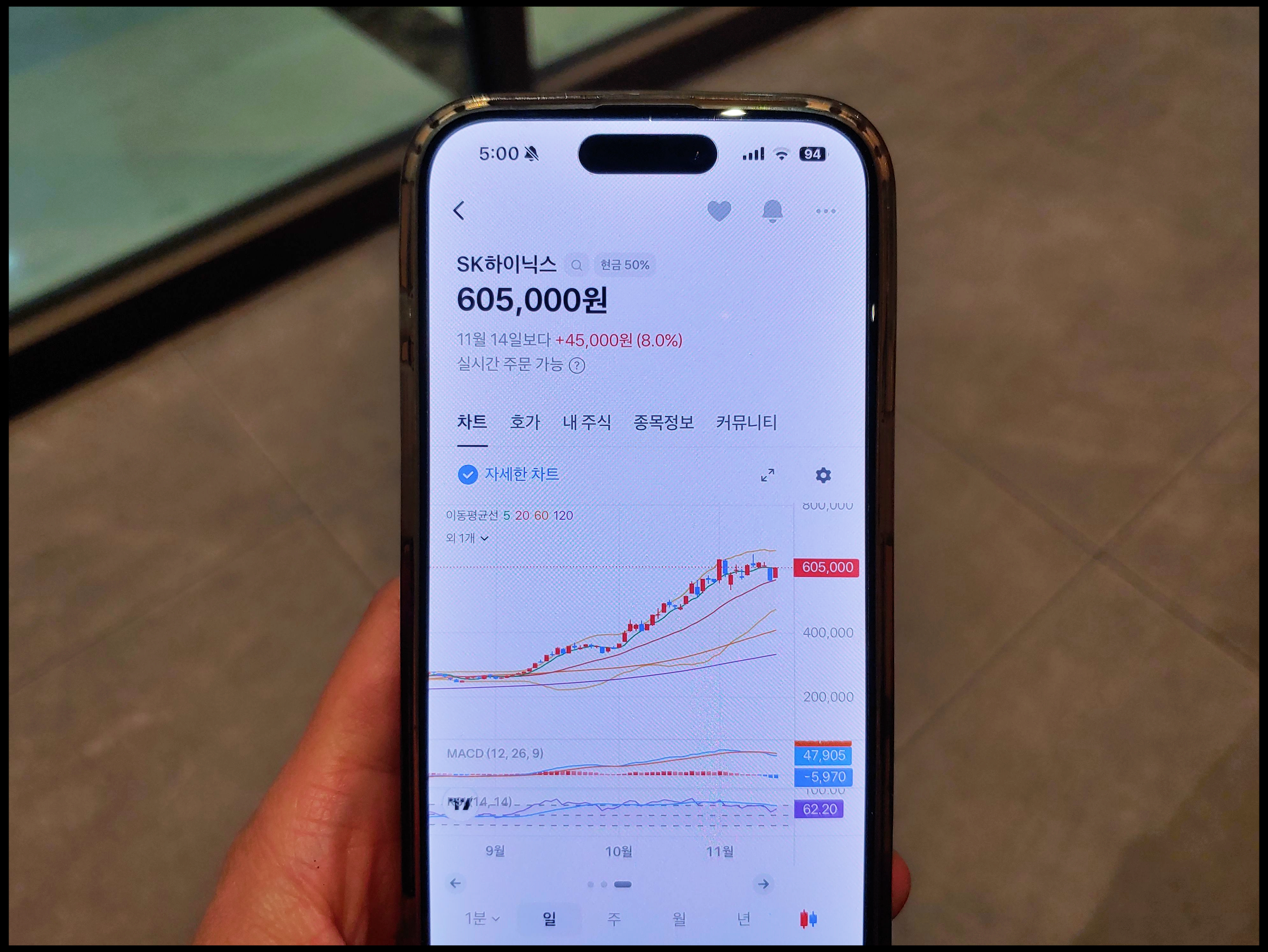 SK하이닉스 목표주가 100만원 지난 11월 3일 SK증권에서 제시했습니다. 발표전일 종가 559,000원 임을 떠올리면 상당히 높게 제시됐습니다. 그 이후 지난 2주 동안의 추이를 보면 60만원 전후를 오가는 중이며 5일선을 지키는 중입니다. 지난 11월 14일에는 7.84% 하락하면서 564,000원으로 내려갔으나 주말 지나 17일이 되면서 8.2% 오른 606,000원 기록중입니다.(현재 기준 애프터장 계속되는 중) 5일선에서 밀리면 다시 회복하는 그림이 나오고 있습니다. 이 종목 앞으로의 추이를 보려면 일봉 5일선 상승 추세 유지 여부를 체크해야 합니다.