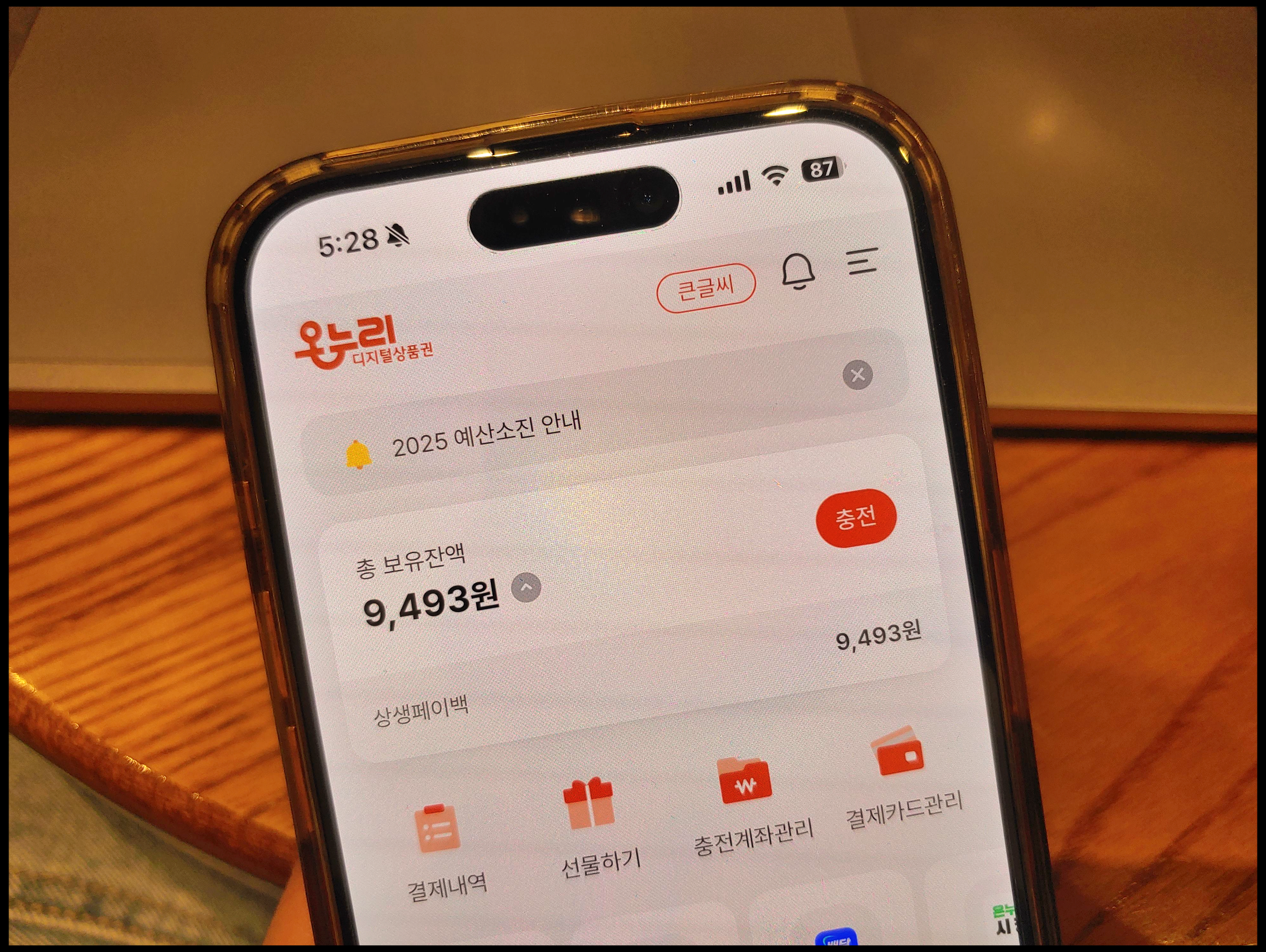 상생페이백 혜택 받은 금액은 디지털 온누리 앱에 자동적으로 들어오는 형태입니다. 저는 10월 사용분 9,493원 환급 받았습니다. 해당 앱에 이미 가입되었기 때문에 9,493원 자동으로 들어왔습니다. 환급 받은 금액은 유효 기간 5년입니다. 만약 지급일에 환급액이 안들어왔다면 해당 앱에 있는 총 보유잔액 확인하시면 됩니다. / 사진 (C) 디지털 온누리 앱