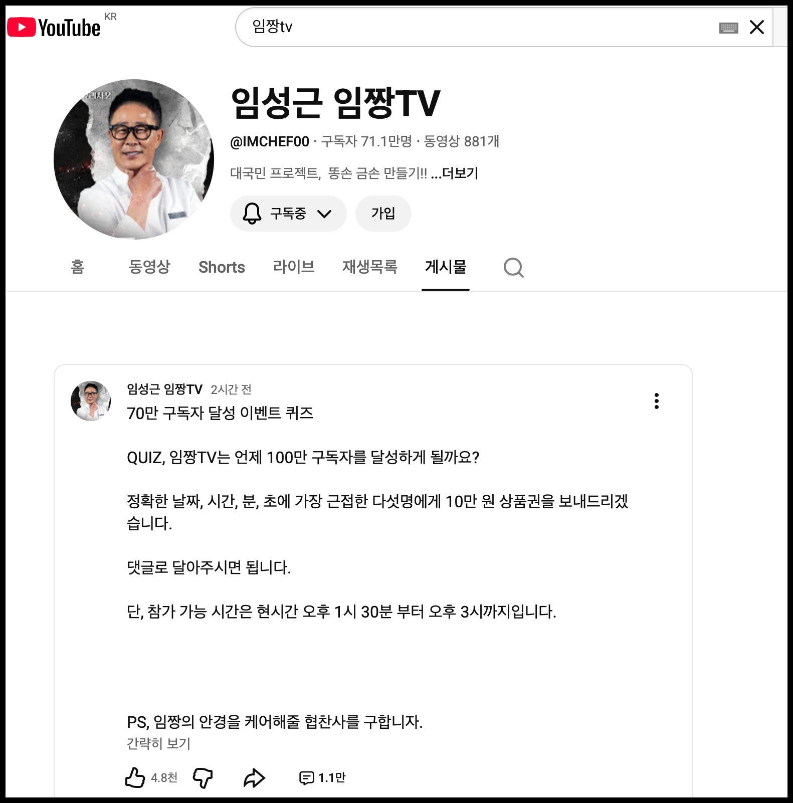 사진 : 임성근 셰프 공식 유튜브 임짱TV 구독자 현재 71만 명입니다. 이 포스팅 작성했을 때에는 70만 명이었는데 어느새 더 늘었습니다. 제가 이 채널 구독했을때 구독자가 30~40만 명 사이에 있었던 때로 기억하는데 지금은 그때보다 2배 더 늘었습니다. 흑백요리사2 수혜를 누리는 셰프 중에 한 명으로 볼 수 있습니다. 최근 업로드되는 영상들 조회수가 100만 뷰 넘는 모습이 하나둘씩 나오고 있습니다. / 임짱TV 공식 유튜브