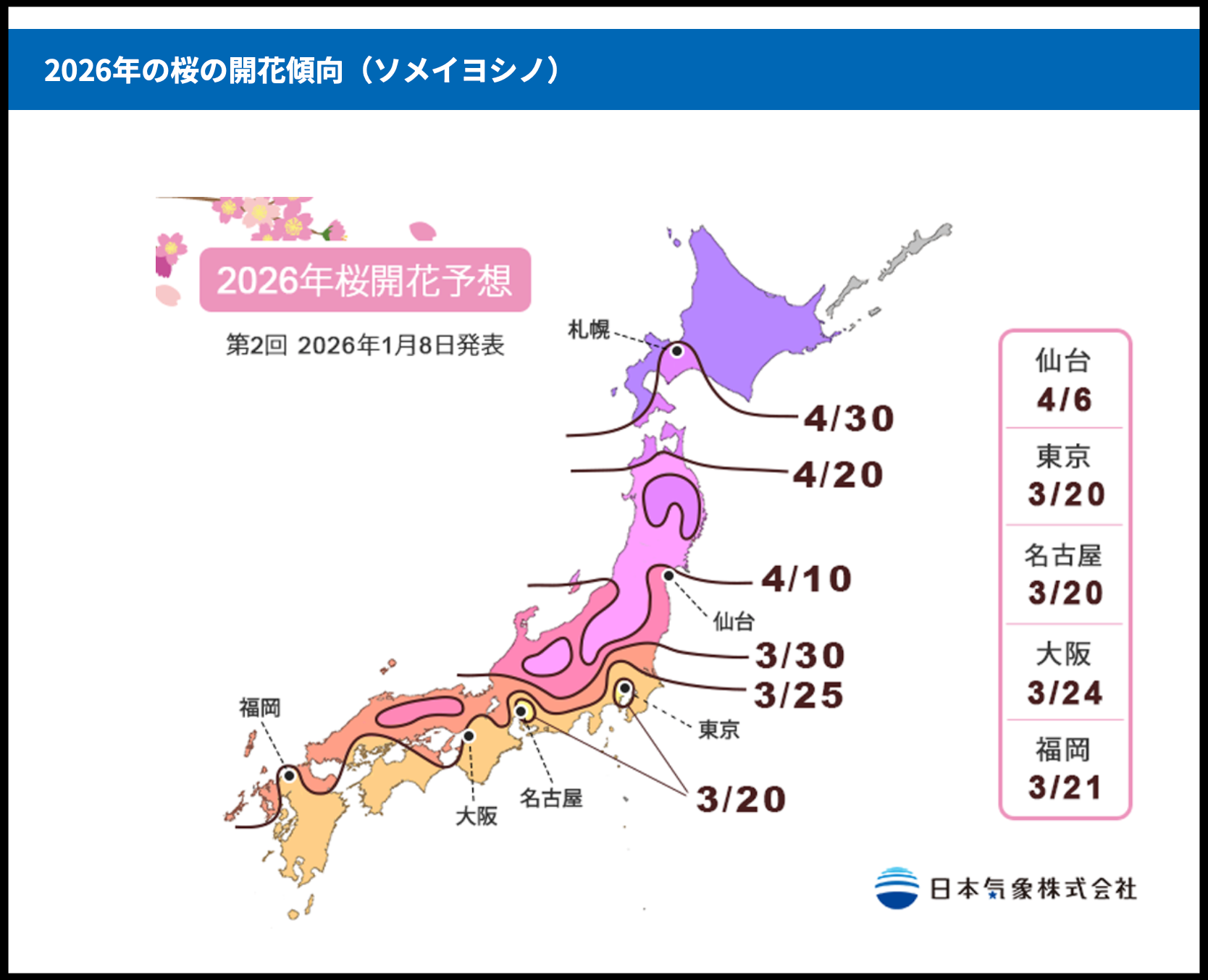 일본 기상 주식회사는 지난 1월 8일 2026 일본 벚꽃 개화시기 및 만개 예상을 발표했습니다. 다음 발표는 1월 22일 예정으로서 그때는 지금과 다른 발표가 나올 가능성 잠재적으로 있습니다. 따라서 이 글에 올라오는 개화시기는 1월 8일 기준이 됩니다. 1월 8일과 22일, 그리고 2월과 3월의 예상이 서로 다를 가능성 있습니다. 향후 2개월 동안의 날씨가 어떻게 될지 알 수 없기 때문입니다.