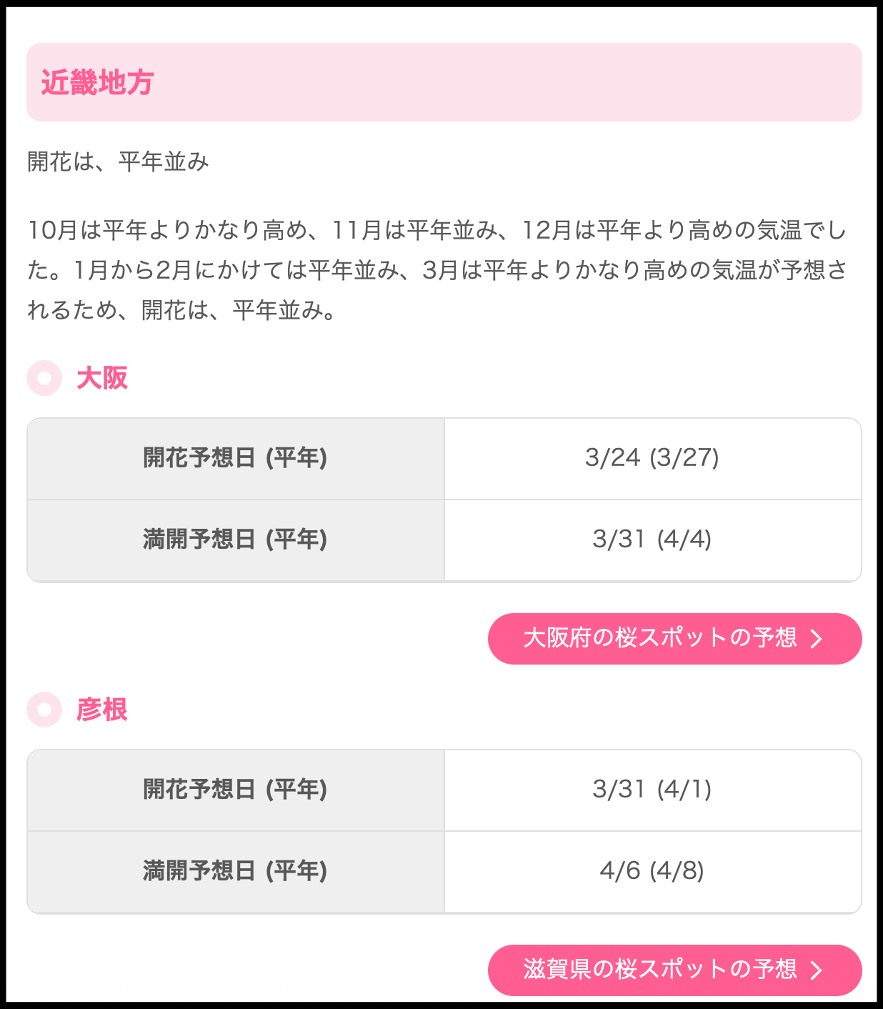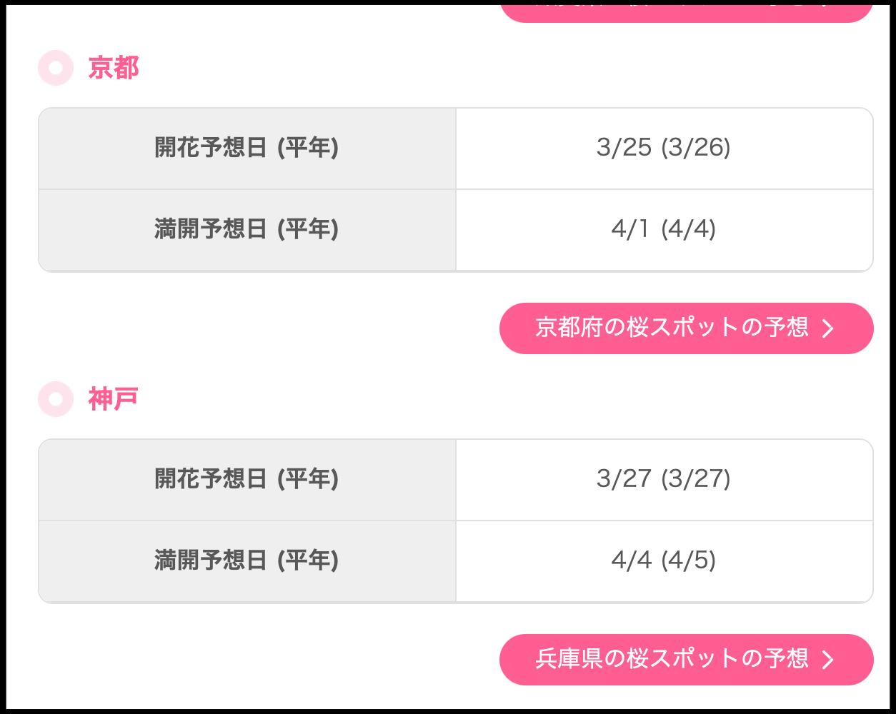 오사카 및 교토 벚꽃 개화시기 2026 평년보다 더 빠른 것으로 예측됐습니다.(일본 기상 주식회사) 이는 앞에서 언급했습니다. 오사카 벚꽃 개화 예상일 3월 24일, 만개 예상일 3월 31일 예측됩니다. 교토 벚꽃 개화 예상일 3월 25일, 만개 예상일 4월 1일 예측된다고 합니다. 3월 31일과 4월 1일 전후로 만개하는 모습을 볼 수 있을 것 같습니다. 두 도시와 가까운 고베 벚꽃 개화 예상일 3월 27일 및 만개 예상일 4월 4일이라고 합니다. 오사카 및 교토에 비하면 다소 늦은 편입니다. / 사진 (C) 일본 기상 주식회사 홈페이지(s.n-kishou.com)