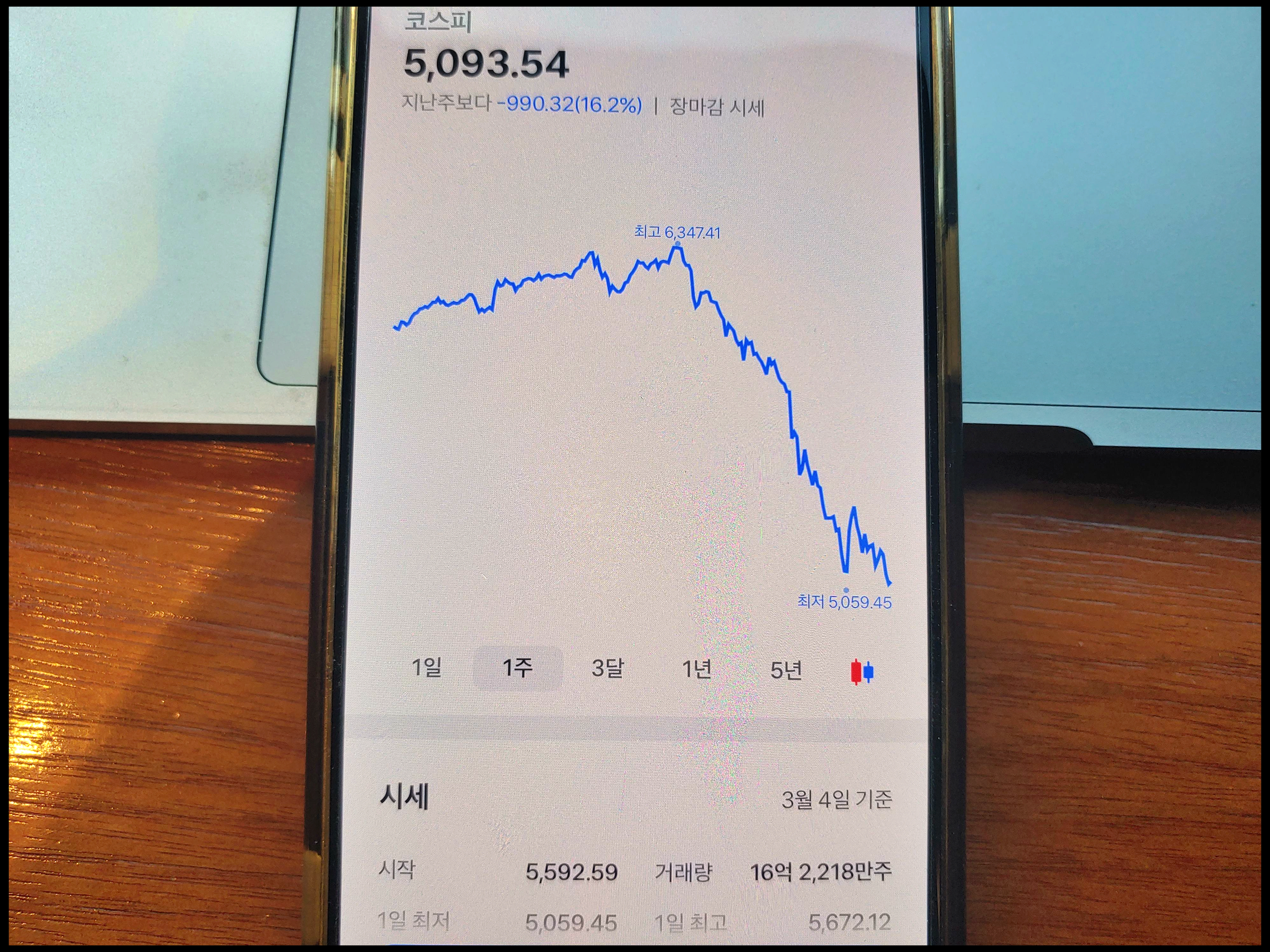 지난 일주일 동안의 코스피 지수입니다. 지난 2월 27일 6300 고지를 찍었으나 어느 순간 5000으로 밀렸습니다. 지난 6월 새로운 정부 출범으로 코스피 5000 달성 여부가 눈길을 모았으며, 그것을 7개월 만에 조기 달성했습니다. 6000 도달도 얼마되지 않았습니다. 목표를 초과 달성했습니다. 하지만 이제는 새로운 상황에 놓였습니다. 코스피 5000 지지구간이 되어 다시 반등 기회를 잡아야 합니다. 미국의 지정학적 이슈가 빠른 시일내에 해결되지 못하면 한국 증시는 더 타격 받을 가능성 있습니다. 호르무즈 해협 문제 풀리지 않으면 쉽지 않습니다.