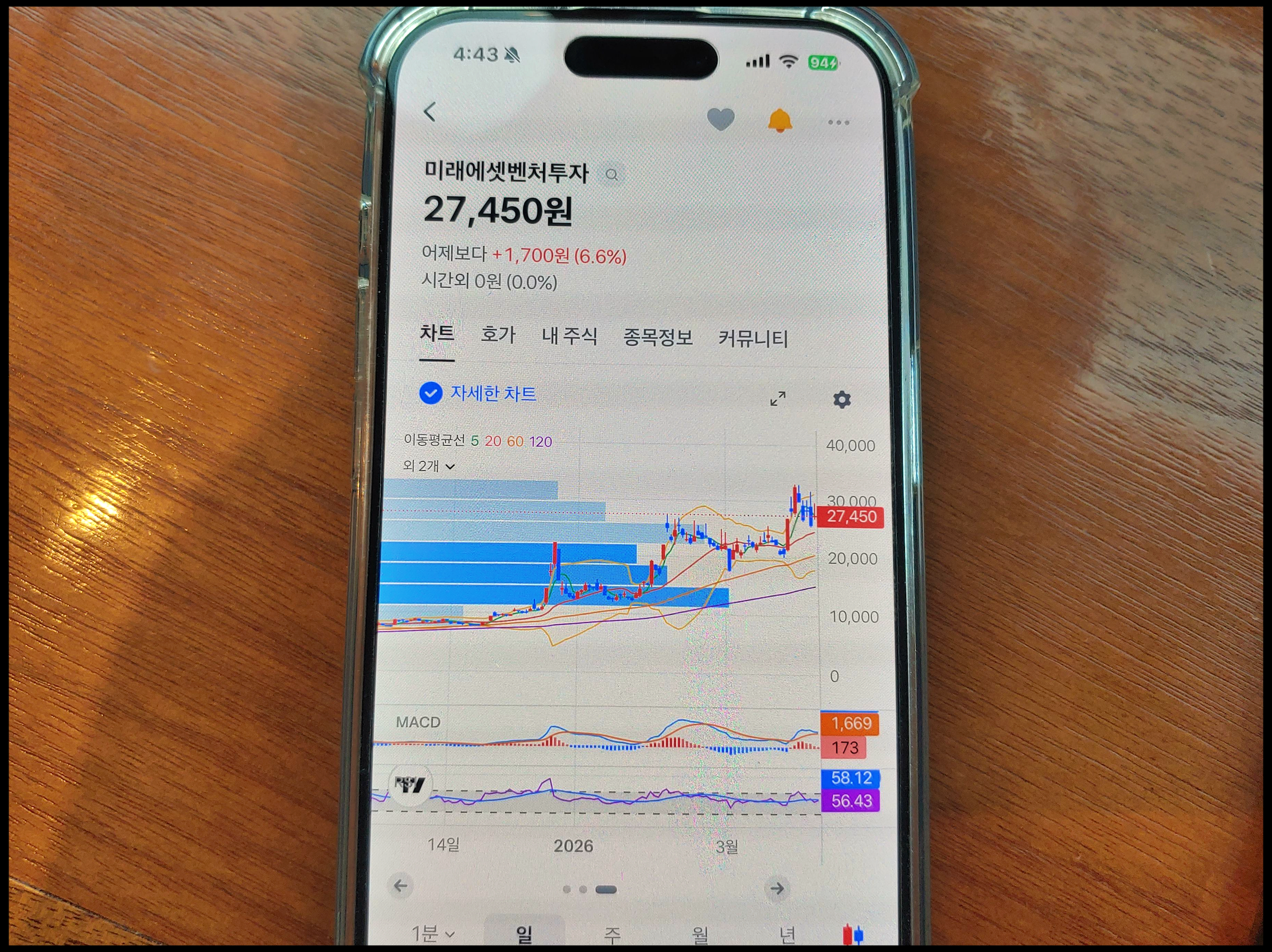 미래에셋벤처투자 최근 시세. 3월 25일 30% 상한가 달성 이후로 변동이 심해졌습니다. 3월 25일과 26일, 27일에 29.80%, 4.62%, 15.22% 올랐으나 그 이후에는 크게 빠지다가 다시 회복하고, 빠지다가 회복하는 흐름이 나오고 있습니다. 같은 기간 미래에셋증권보다 변동이 더 큽니다. 두 기업의 시가총액 규모가 서로 다른 특성상, 무게가 가벼운 종목의 변동이 더 클 수밖에 없습니다. 슈팅이 나올 때 크게 오를 수 있으나 반대로 크게 빠지기도 합니다. / 사진 (C) 토스 앱