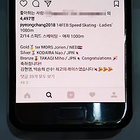 [사진 = 2018 평창동계올림픽 공식 인스타그램에서는 여자 쇼트트랙 최민정 1500m 금메달 축하하는 게시물을 올렸습니다. (C) 2018 평창동계올림픽 공식 인스타그램]