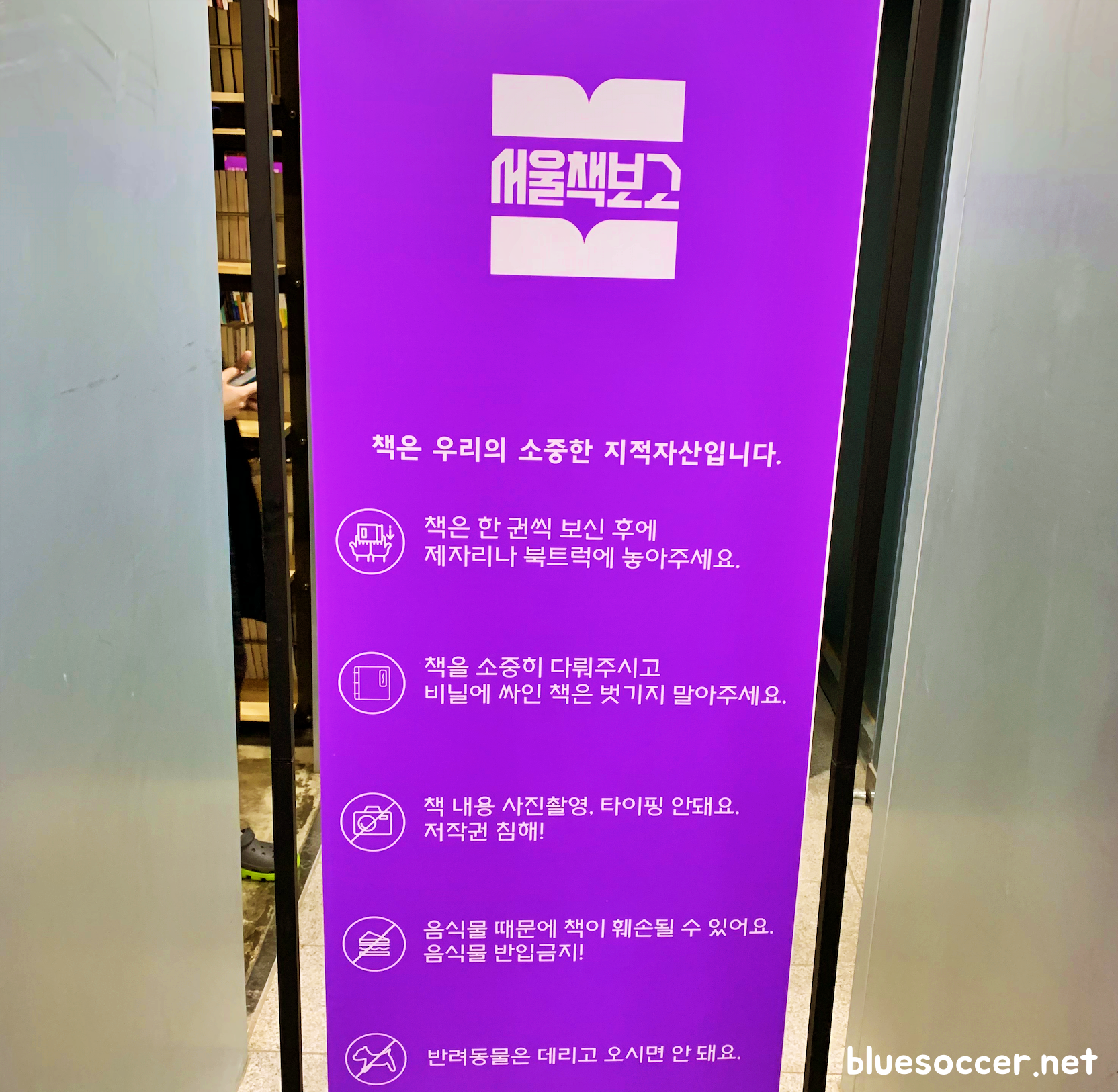 다만, 서울책보고 전체가 사진 촬영이 제한되는 것은 아닙니다. 이미 온라인에 서울책보고 관련 사진이 많이 돌아다니는 중입니다. 실제로 제가 이곳을 찾았을 때에도 실내 모습을 사진에 담기위한 목적으로 스마트폰 촬영하는 사람들을 꽤 봤습니다. 카메라로 사진 촬영하는 분도 봤습니다.(이쯤에서 실내 촬영하는 사람들이 있는 이유에 궁금증을 느끼기 쉬운데 그 부분은 뒤에서 다루도록 하겠습니다.) 실내 모습을 촬영하는 것은 괜찮으나 책 내용 사진 촬영은 허용되지 않는다고 인지하시면 됩니다. 이 밖에 서울책보고에서는 음식물을 반입할 수 없으며 반려동물과 함께하시면 안됩니다.