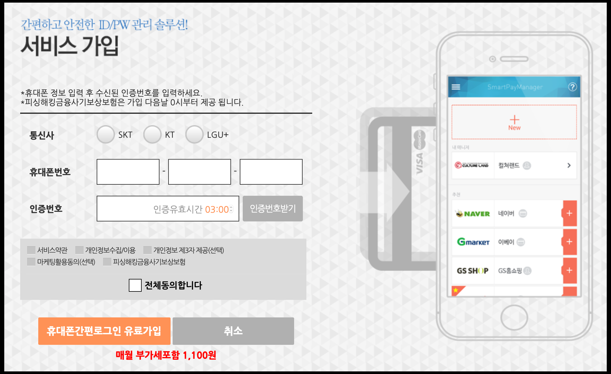간편결제서비스 및 휴대폰간편로그인 가입은 해당 홈페이지에서 접속하시면 됩니다. 또는 1599-4704로 전화를 걸어서 가입하는 방법도 있습니다. 월 1,100원(부가세포함)의 유료 가입을 할 수 있으나 가입 당일에 해지할 경우 이용료가 부과되지 않습니다.