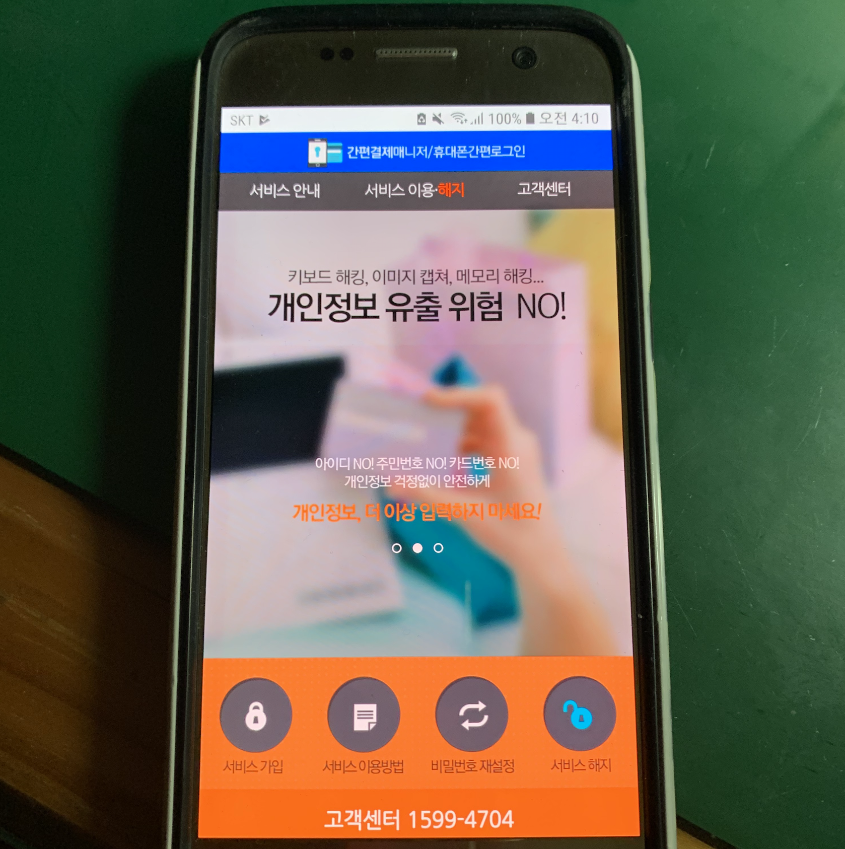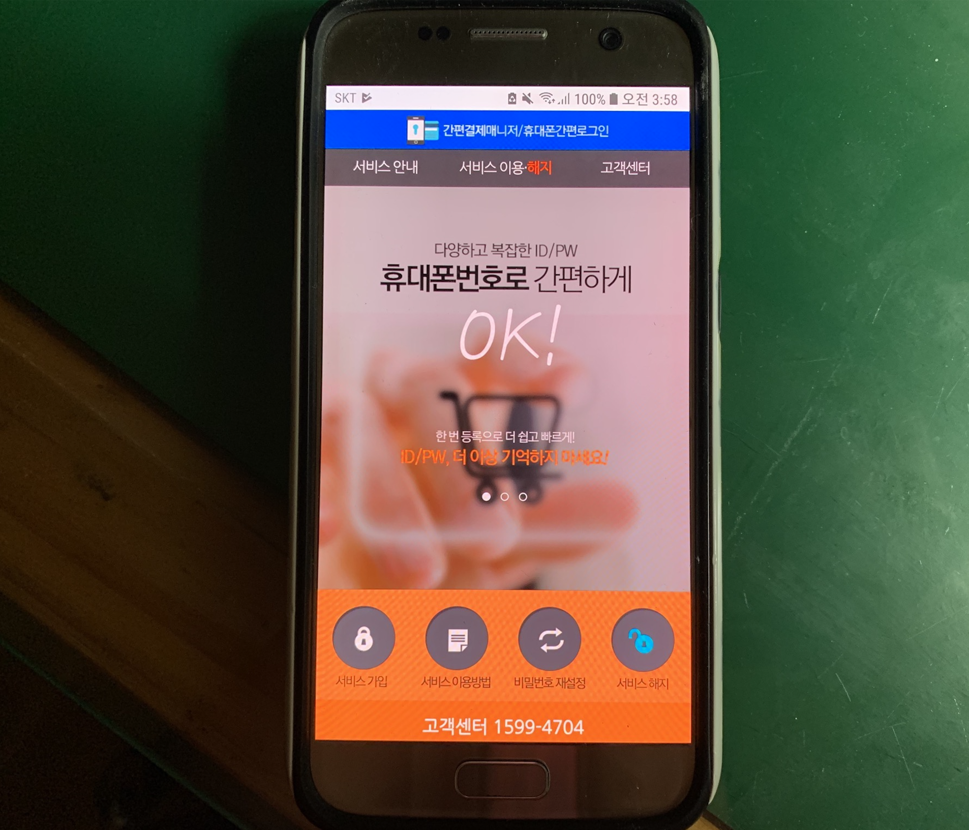 그 이후에는 간편결제서비스 앱을 설치해야 합니다. 해당 홈페이지 메인에 '앱 다운로드 받기'라는 메뉴가 있습니다. 이동통신사 선택 및 휴대폰번호를 입력하시면 됩니다.(아이폰 지원 예정) 그러면 문자를 통해 앱 설치에 대한 안내를 받습니다. 문자에 언급된 홈페이지에 접속하면 구글 플레이 스토어에 있는 '간편결제매니저 휴대폰간편로그인'((주)민앤지)라는 이름의 앱이 나옵니다. 그 앱을 설치하면 됩니다.